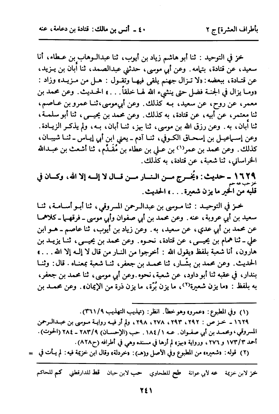 خز فِي التَّوْحِيدِ: ثنا مُوسَى بْنُ عَبْدِ الرَّحْمَنِ الْمَسْرُوقِيُّ، ثنا أَبُو أُسَامَةَ، ثنا سَعِيدُ بْنُ أَبِي عَرُوبَةَ، عَنْهُ، وَعَنْ مُحَمَّدِ بْنِ أَبِي صَفْوَانَ وَأَبِي مُوسَى، فَرَّقَهُمَا، كِلاهُمَا عَنْ مُحَمَّدِ بْنِ أَبِي عَدِيٍّ، عَنْ سَعِيدٍ، بِهِ. وَعَنْ زِيَادِ بْنِ أَيُّوبَ، ثَنا عَاصِمٌ، هُوَ ابْنُ عَلِيٍّ، ثنا هَمَّامُ بْنُ يَحْيَى عَنْ قَتَادَةَ، نَحْوَهُ، وَعَنْ مُحَمَّدِ بْنِ يَحْيَى، ثنا يَزِيدُ بْنُ هَارُونَ، أنا شُعْبَةُ بِلَفْظِ " يَقُولُ اللَّهُ: أَخْرِجُوا مِنَ النَّارِ مَنْ قَالَ: لا إِلَهَ إِلا اللَّهُ ... " الْحَدِيثَ. وَعَنْ مُحَمَّدِ بْنِ بَشَّارٍ، ثنا مُحَمَّدُ بْنُ جَعْفَرٍ، ثنا شُعْبَةُ، بِمَعْنَاهُ. قَالَ: وثنا بُنْدَارٌ، فِي عَقِبِهِ ثنا أَبُو دَاوُدَ، عَنْ شُعْبَةَ، نَحْوَهُ. وَعَنْ أَبِي مُوسَى، ثنا مُحَمَّدُ بْنُ جَعْفَرٍ، بِهِ بِلَفْظِ: " مَا يَزِنُ شَعِيرَةً، مَا يَزِنُ بُرَّةً، مَا يَزِنُ ذَرَّةً مِنَ الإِيمَانِ ". وَعَنْ مُحَمَّدِ بْنِ