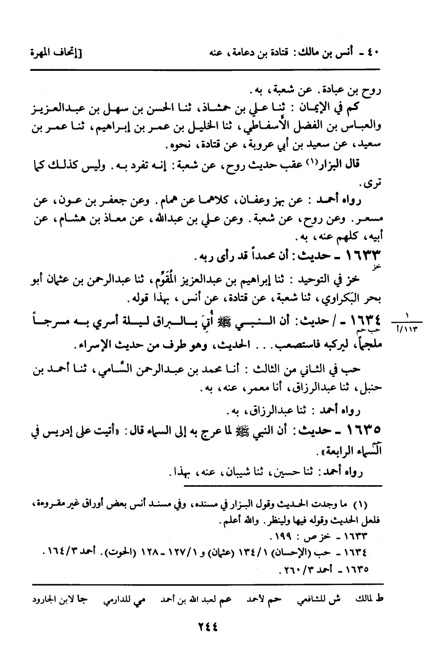 1634 - حَدِيثٌ (حب حم) : أَنَّ النَّبِيَّ، صلى الله عليه وسلم، أُتِيَ بِالْبُرَاقِ لَيْلَةَ أُسْرِيَ بِهِ مُسْرَجًا مُلْجَمًا، لَيَرْكَبَهُ فَاسْتَصَعَب ... الْحَدِيثَ، وَهُوَ طَرَفٌ مِنْ حَدِيثِ الإِسْرَاءِ.