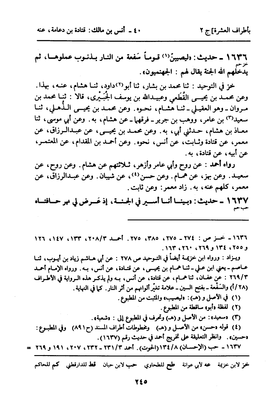 خز فِي التَّوْحِيدِ: ثنا مُحَمَّدُ بْنُ بَشَّارٍ، ثنا أَبُو دَاوُدَ، ثنا هِشَامٌ، عَنْهُ، بِهَذَا. وَعَنْ مُحَمَّدِ بْنِ يَحْيَى الْقُطَعِيِّ وَعُبَيْدِ اللَّهِ بْنِ يُوسُفَ الْجَبْرِيِّ، قَالا: ثنا مُحَمَّدُ بْنُ مَرْوَانَ، وَهُوَ الْعُقَيْلِيُّ، ثنا هِشَامٌ، نَحْوَهُ. وَعَنْ مُحَمَّدِ بْنِ يَحْيَى الذُّهْلِيِّ، ثنا سَعِيدُ بْنُ عَامِرٍ، وَوَهْبُ بْنُ جَرِيرٍ، فَرَّقَهُمَا، عَنْ هِشَامٍ، بِهِ. وَعَنْ أَبِي مُوسَى، ثنا مُعَاذُ بْنُ هِشَامٍ، حَدَّثَنِي أَبِي، بِهِ. وَعَنْ مُحَمَّدِ بْنِ يَحْيَى، عَنْ عَبْدِ الرَّزَّاقِ، عَنْ مَعْمَرٍ، عَنْ قَتَادَةَ وَثَابِتٍ، عَنْ أَنَسٍ، نَحْوَهُ. وَعَنْ أَحْمَدَ بْنِ الْمِقْدَامِ، عَنِ الْمُعْتَمِرِ، عَنْ أَبِيهِ، عَنْ قَتَادَةَ، بِهِ.