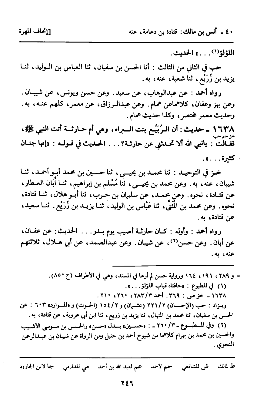 1638 - حَدِيثٌ (خز حم حب) : أَنَّ الرُّبَيِّعَ بِنْتَ الْبَرَاءِ، وَهِيَ أُمُّ حَارِثَةَ، أَتَتِ النَّبِيَّ، صلى الله عليه وسلم، فَقَالَتْ: يَا نَبِيَّ اللَّهِ، أَلا تُحَدِّثُنِي عَنْ حَارِثَةَ؟ ... الْحَدِيثَ فِي قَوْلِهِ: " إِنَّهَا جِنَانٌ كَثِيرَةٌ ... ".