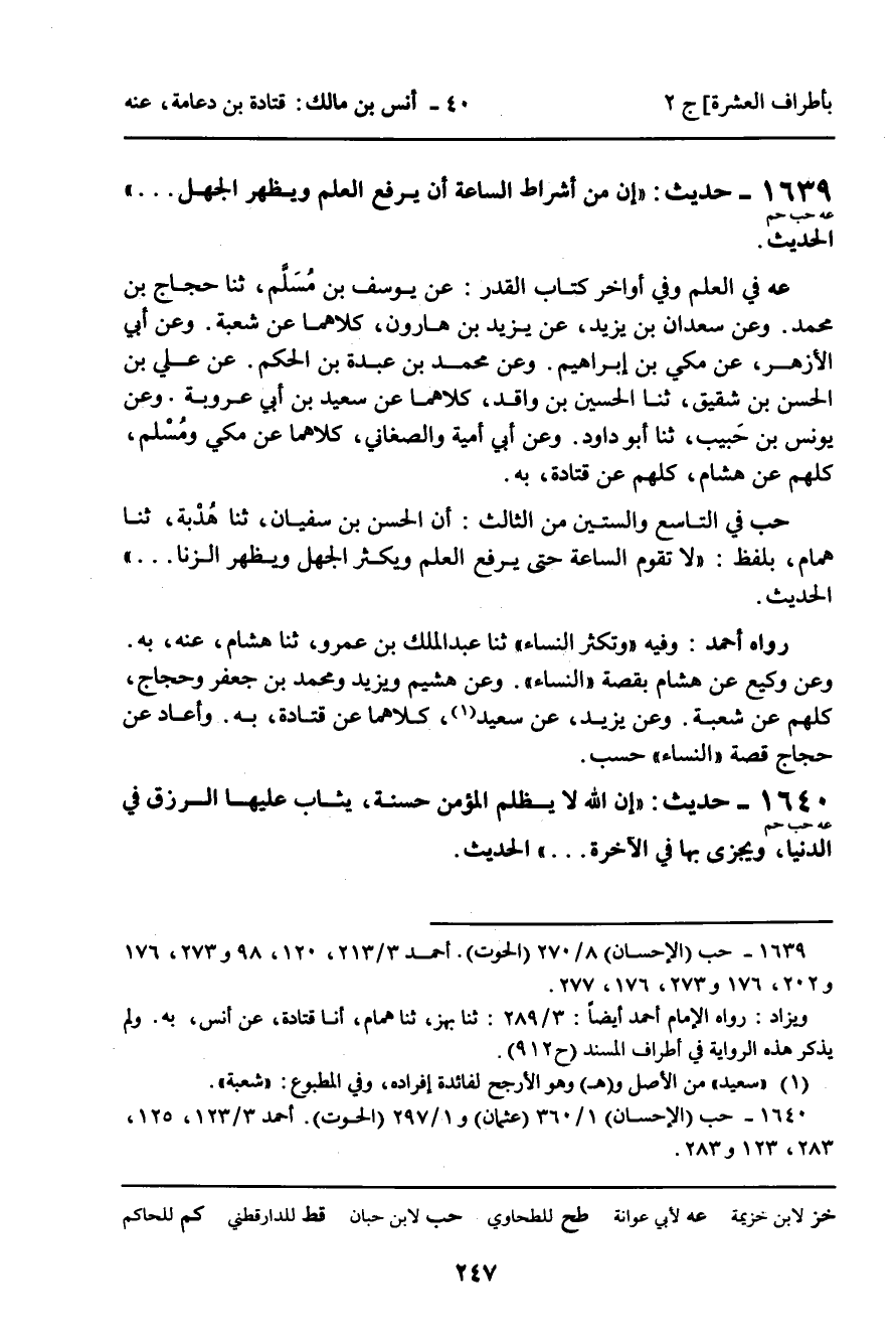 1639 - حَدِيثٌ (عه حب حم) : " إِنَّ مِنْ أَشْرَاطِ السَّاعَةِ أَنْ يُرْفَعَ الْعِلْمُ وَيَظْهَرَ الْجَهْلُ ... " الْحَدِيثَ.