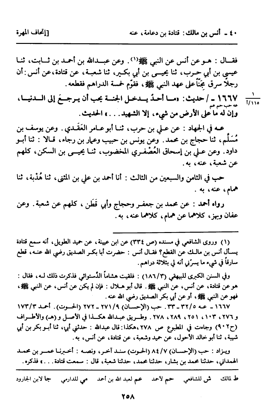 1667 - حَدِيثٌ (عه حب حم عم) : " مَا أَحَدٌ يَدْخُلُ الْجَنَّةَ يُحِبُّ أَنْ يَرْجِعَ إِلَى الدُّنْيَا، وَإِنَّ لَهُ مَا عَلَى الأَرْضِ مِنْ شَيْءٍ، إِلا الشَّهِيدُ ... " الْحَدِيثَ.