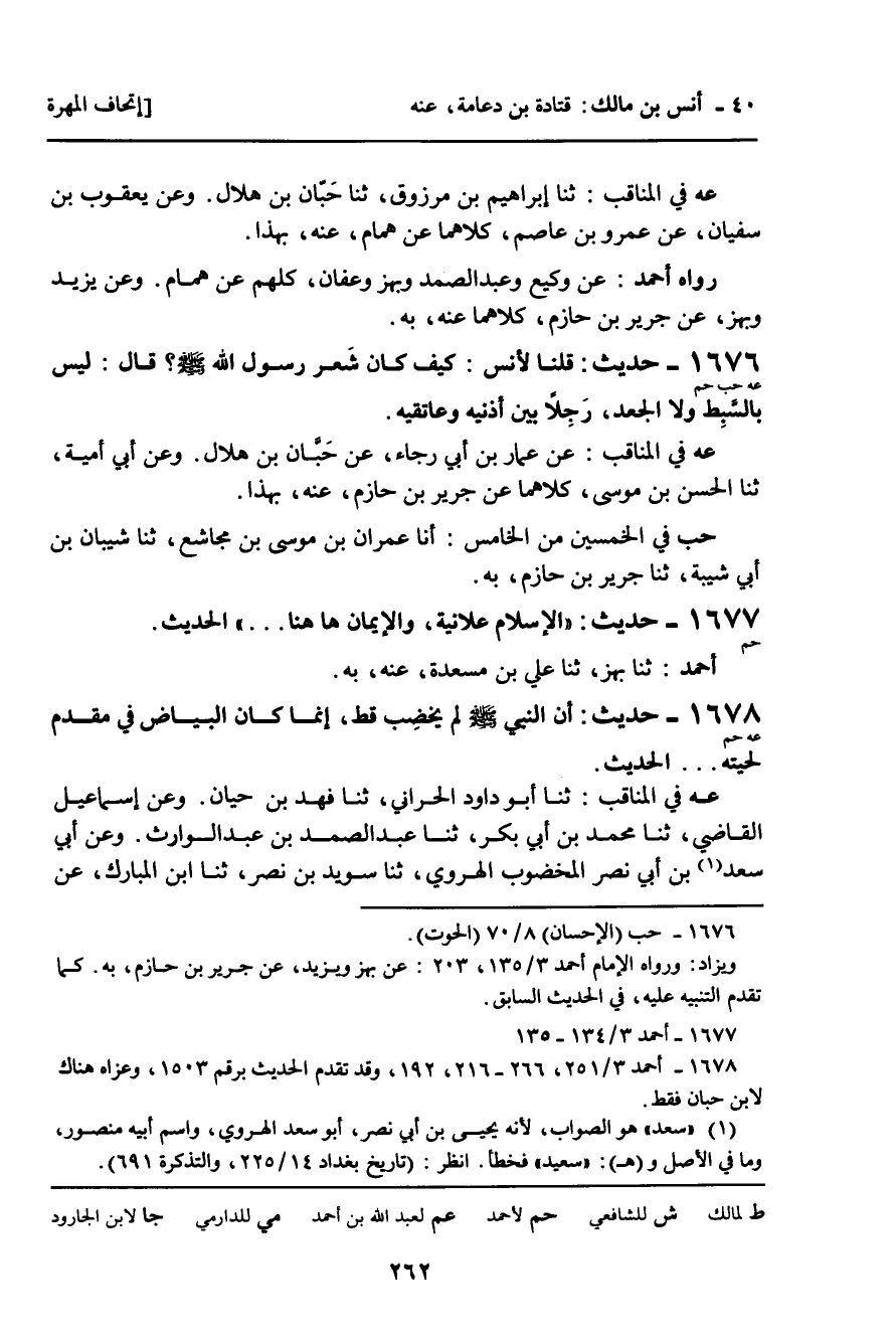 رَوَاهُ أَحْمَدُ وَأَوَّلُهُ: قُلْتُ لأَنَسٍ: خَضَبَ رَسُولُ اللَّهِ، صلى الله عليه وسلم. . ... الْحَدِيثَ: ثنا عَفَّانُ، ثنا هَمَّامٌ، عَنْهُ، بِهِ. وَعَنْ عَتَّابٍ وَعَلِيِّ بْنِ إِسْحَاقَ، كِلاهُمَا عَنِ الْمُبَارَكِ. وَعَنْ أَبِي سَعِيدٍ، هُوَ مَوْلَى أَبِي هَاشِمٍ، كِلاهُمَا عَنِ الْمُثَنَّى، هُوَ ابْنُ سَعِيدٍ، عَنْ قَتَادَةَ، بِهِ.