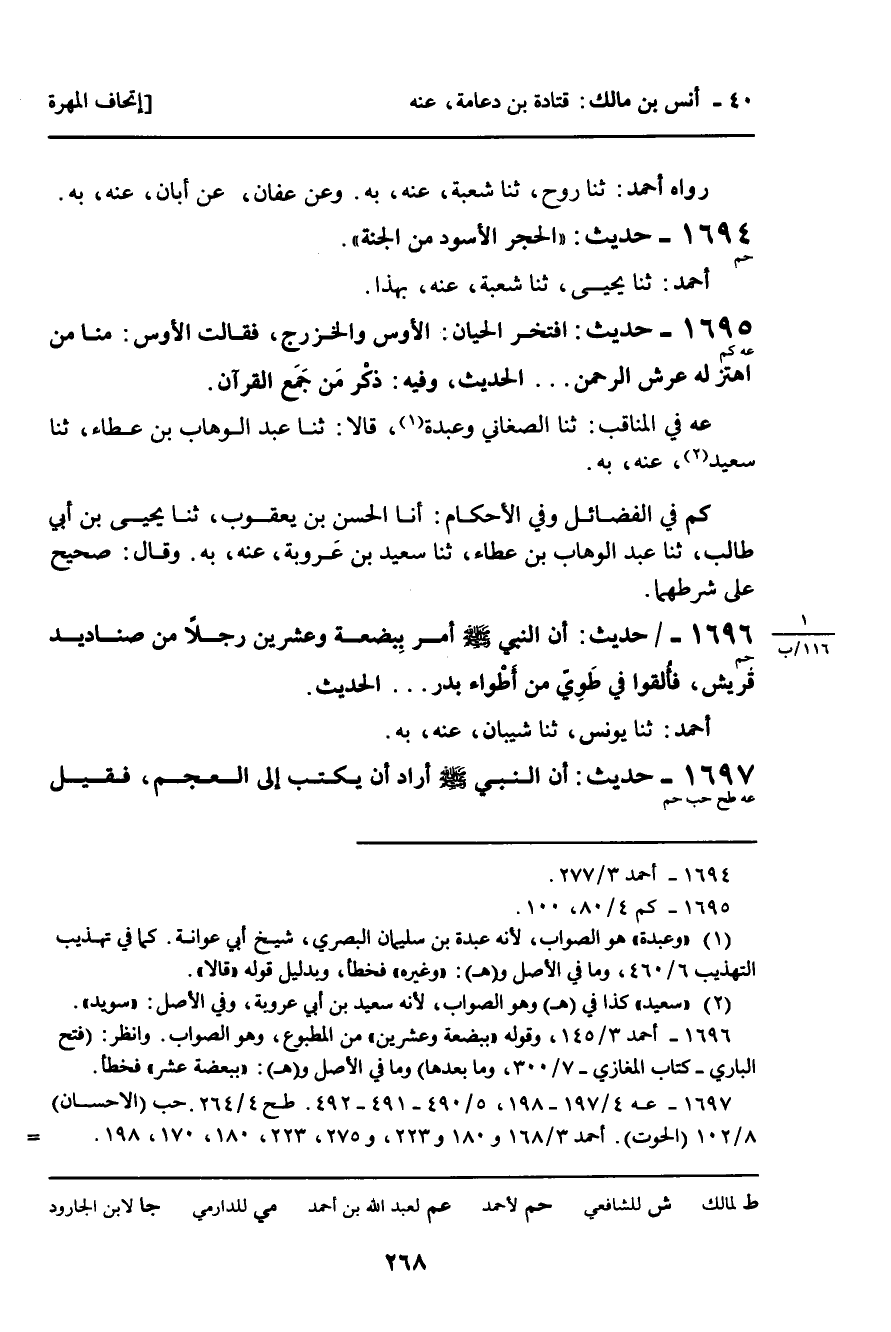 عه فِي الْجِهَادِ: ثنا أَحْمَدُ بْنُ عِصَامٍ، ثنا مُعَاذُ بْنُ هِشَامٍ، ثنا أَبِي، عَنْهُ، بِهِ. وَعَنْ طَاهِرِ بْنِ خَالِدِ بْنِ نِزَارٍ، ثنا أَبِي، ثنا إِبْرَاهِيمُ بْنُ طَهْمَانَ، عَنِ الْحَجَّاجِ بْنِ الْحَجَّاجِ، عَنْهُ، نَحْوَهُ. وَعَنْ عَبْدِ الرَّحْمَنِ بْنِ مَرْزُوقٍ وَابْنِ أَبِي الْعَوَّامِ، قَالا: ثنا عَبْدُ الْوَهَّابِ بْنُ عَطَاءٍ، ثنا سَعِيدٌ، عَنْهُ، نَحْوَهُ. وَقَالَ: أَرَادَ أَنْ يَكْتُبَ إِلَى كِسْرَى وَقَيْصَرَ. وَعَنْ عَمَّارٍ، ثنا أَبُو دَاوُدَ. وَعَنِ الصَّغَانِيِّ، ثنا أَبُو النَّضْرِ. وَعَنْ يُوسُفَ بْنِ مُسَلَّمٍ، ثنا حَجَّاجٌ، ثَلاثَتُهُمْ عَنْ شُعْبَةَ، عَنْهُ، بِهِ. وَقَالَ فِيهِ: أَرَادَ أَنْ يَكْتُبَ إِلَى الرُّومِ. وَأَعَادَهُ فِي اللِّبَاسِ: عَنْ أَبِي عَوْفٍ وَابْنِ أَبِي الْعَوَّامِ وَيُوسُفَ بْنِ سَعِيدٍ وَطَاهِرِ بْنِ خَالِدٍ وَأَحْمَدَ بْنِ عِصَامٍ، بِأَسَانِيدِهِمْ. وَعَنِ الدَّقِيقِيِّ وَالصَّغَانِيِّ، قَالا: ثنا أَبُو عَاصِمٍ، عَنْ سَعِيدٍ، عَنْ قَتَادَةَ، مُخْتَصَرٌ بِلَفْظِ: اتَّخَذَ النَّبِيُّ، صلى الله عليه وسلم، خَاتَمًا مِنْ فِضَّةٍ، كَانَ فِيهِ مُحَمَّدٌ رَسُولُ اللَّهِ.