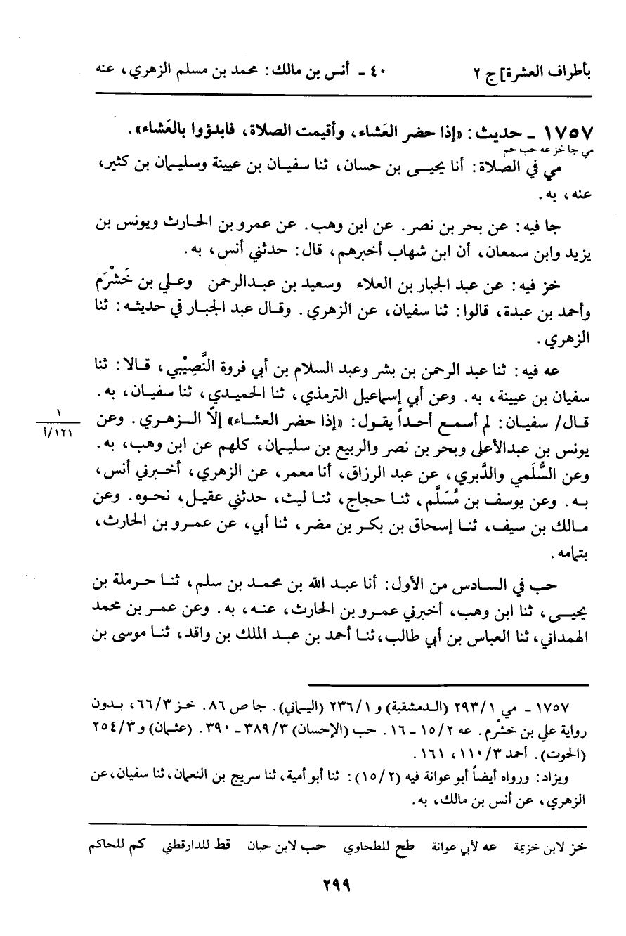عه فِيهِ: ثنا عَبْدُ الرَّحْمَنِ بْنُ بِشْرٍ وَعَبْدُ السَّلامِ بْنُ أَبِي فَرْوَةَ النَّصِيبِيُّ، قَالا: ثنا سُفْيَانُ بْنُ عُيَيْنَةَ، بِهِ. وَعَنْ أَبِي إِسْمَاعِيلَ التِّرْمِذِيِّ، ثنا الْحُمَيْدِيُّ، ثنا سُفْيَانُ، بِهِ. قَالَ سُفْيَانُ: لَمْ أَسْمَعْ أَحَدًا يَقُولُ: " إِذَا حَضَرَ الْعَشَاءُ " إِلا الزُّهْرِيَّ. وَعَنْ يُونُسَ بْنِ عَبْدِ الأَعْلَى وَبَحْرِ بْنِ نَصْرٍ وَالرَّبِيعِ بْنِ سُلَيْمَانَ، كُلُّهُمْ عَنِ ابْنِ وَهْبٍ، بِهِ.