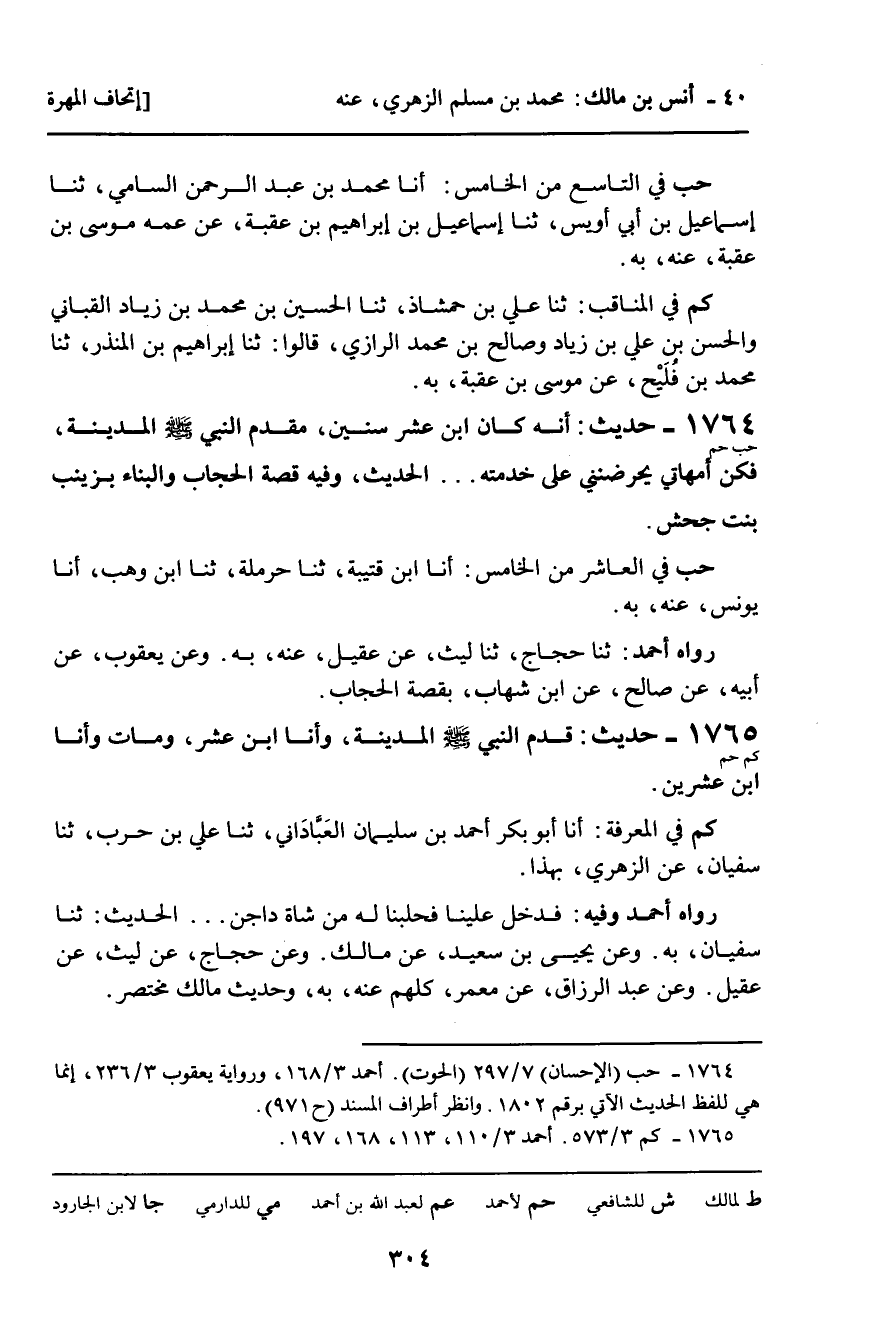 1764 - حَدِيثٌ (حب حم) : أَنَّهُ كَانَ ابْنَ عَشْرِ سِنِينَ، مَقْدَمَ النَّبِيِّ، صلى الله عليه وسلم، الْمَدِينَةَ، فَكُنَّ أُمَّهَاتِي يُحَرِّضْنَنِي عَلَى خِدْمَتِهِ ... . الْحَدِيثَ، وَفِيهِ قِصَّةُ الْحِجَابِ وَالْبِنَاءِ بِزَيْنَبَ بِنْتِ جَحْشٍ م.
