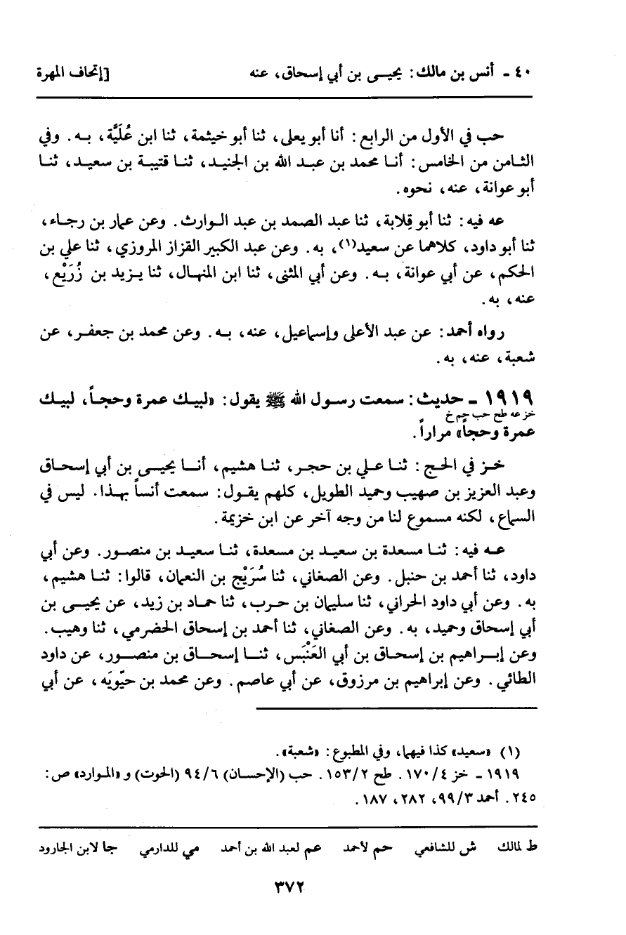عه فِيهِ: ثنا مَسْعَدَةُ بْنُ سَعِيدِ بْنِ مَسْعَدَةَ، ثَنا سَعِيدُ بْنُ مَنْصُورٍ، عَنْ أَبِي دَاوُدَ، ثنا أَحْمَدُ بْنُ حَنْبَلٍ، وَعَنِ الصَّغَانِيِّ، ثنا سُرَيْجُ بْنُ النُّعْمَانِ، قَالُوا: ثنا هُشَيْمٌ، بِهِ. وَعَنْ أَبِي دَاوُدَ الْحَرَّانِيِّ، ثنا سُلَيْمَانُ بْنُ حَرْبٍ، ثنا حَمَّادُ بْنُ زَيْدٍ، عَنْ يَحْيَى بْنِ أَبِي إِسْحَاقَ وَحُمَيْدٍ، بِهِ. وَعَنِ الصَّغَانِيِّ، ثَنا أَحْمَدُ بْنُ إِسْحَاقَ الْحَضْرَمِيُّ، ثنا وُهَيْبٌ. وَعَنْ إِبْرَاهِيمَ بْنِ إِسْحَاقَ بْنِ أَبِي الْعَنْبَسِ، ثَنا إِسْحَاقُ بْنُ مَنْصُورٍ، عَنْ دَاوُدَ الطَّائِيِّ. وَعَنْ إِبْرَاهِيمَ بْنِ مَرْزُوقٍ، عَنْ أَبِي عَاصِمٍ. وَعَنْ مُحَمَّدِ بْنِ حَيُّوَيْهِ، عَنْ أَبِي