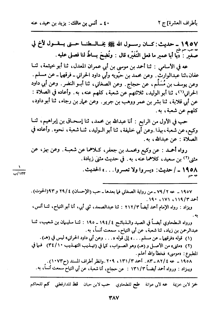 1957 - حَدِيثٌ (عه حب حم طح) : كَانَ رَسُولُ اللَّهِ، صلى الله عليه وسلم، يُخَالِطُنَا حَتَّى يَقُولَ لأَخٍ لِي صَغِيرٌ: يَا أَبَا عُمَيْرٍ، مَا فَعَلَ النُّغَيْرُ؟ " قَالَ: وَنُضِحَ بِسَاطٌ لَنَا فَصَلَّى عَلَيْهِ.