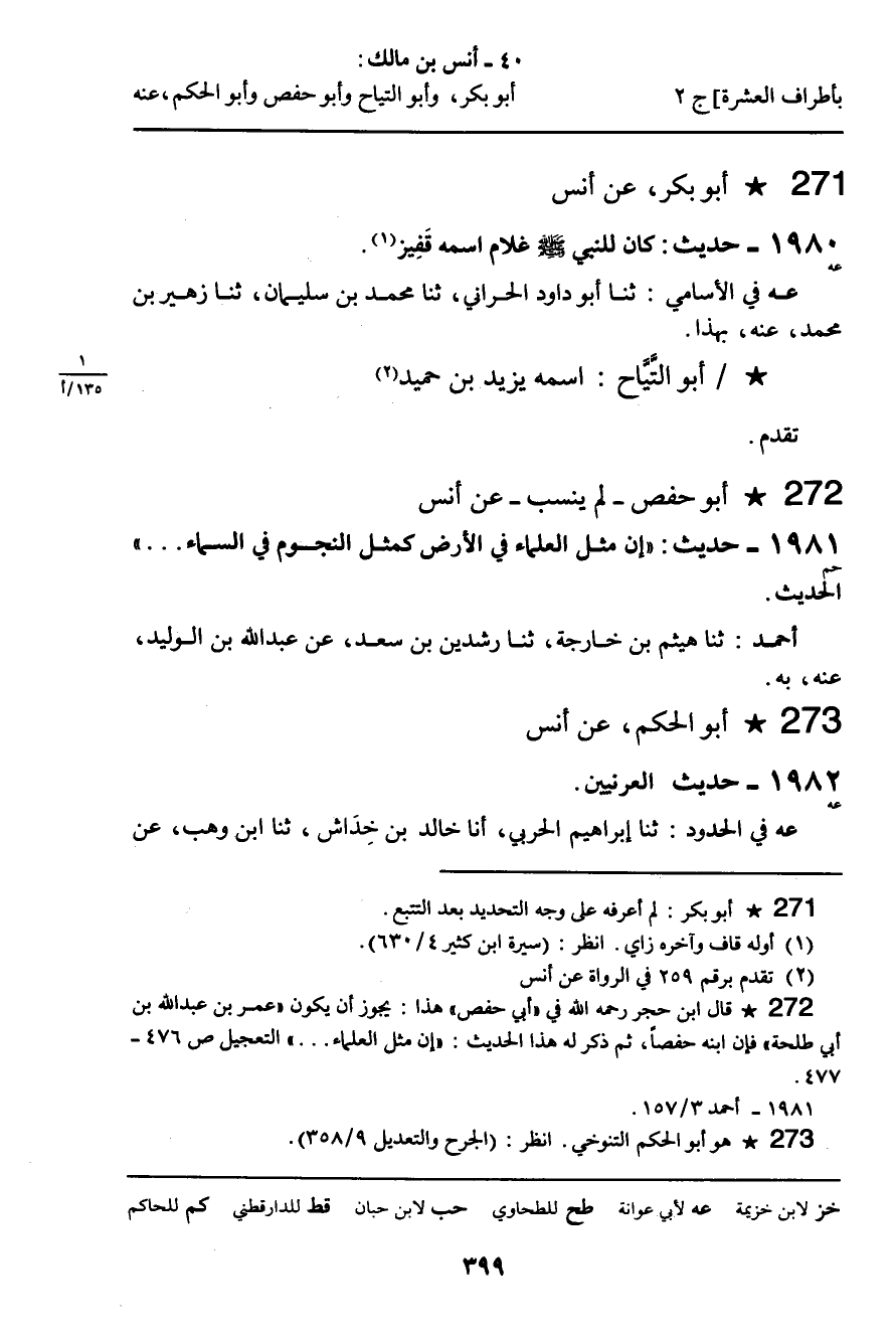 1981 - حَدِيثٌ (حم) : إِنَّ مَثَلَ الْعُلَمَاءِ فِي الأَرْضِ كَمَثَلِ النُّجُومِ فِي السَّمَاءِ ... " الْحَدِيثَ.