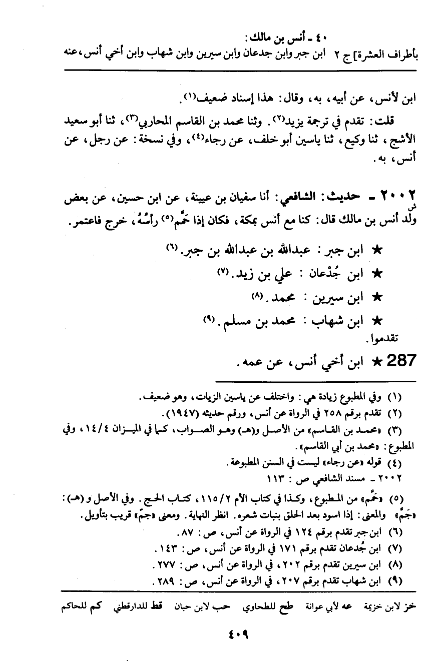 2002 - حَدِيثٌ (ش) : الشَّافِعِيُّ: أنا سُفْيَانُ بْنُ عُيَيْنَةَ، عَنِ ابْنِ حُسَيْنٍ، عَنْ بَعْضِ وَلَدِ أَنَسِ بْنِ مَالِكٍ، قَالَ: كُنَّا مَعَ أَنَسٍ بِمَكَّةَ، فَكَانَ إِذَا حَمَّمَ رَأْسُهُ، خَرَجَ فَاعْتَمَرَ. .