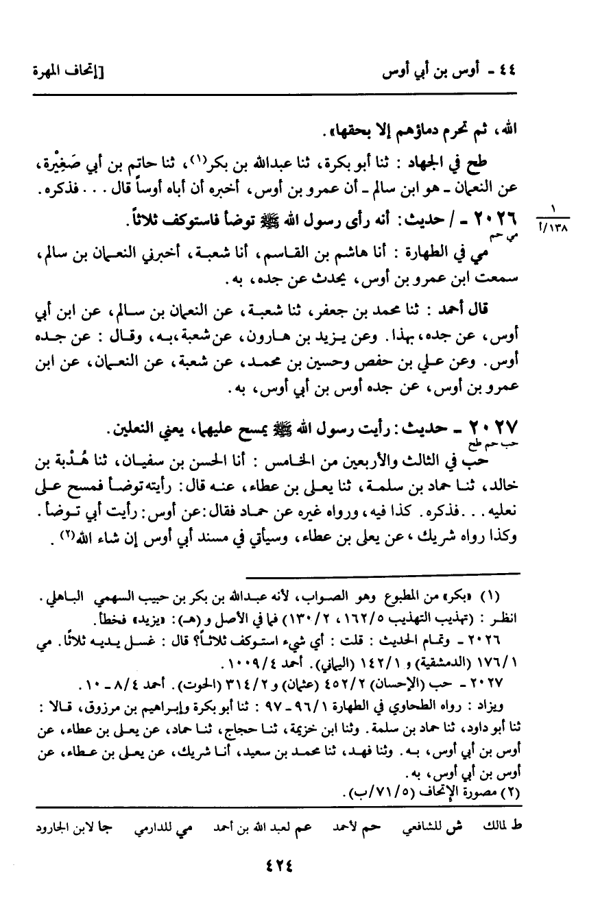 أَحْمَدُ: عَنْ يَحْيَى بْنِ سَعِيدٍ وَبَهْزِ وَعَفَّانَ وَمُحَمَّدِ بْنِ جَعْفَرٍ، كُلُّهُمْ عَنْ شُعْبَةَ، عَنِ النُّعْمَانِ بْنِ سَالِمٍ، عَنِ ابْنِ أَبِي أَوْسٍ، عَنْ جَدِّهِ أَوْسٍ، بِهِ. وَعَنْ وَكِيعٍ، عَنْ شُعْبَةَ بِلَفْظِ: صلى الله عليه وسلم، فِي نَعْلَيْهِ وَاسْتَوْكَفَ ثَلاثًا. وَعَنْ بَهْزٍ، عَنْ حَمَّادِ بْنِ سَلَمَةَ، نَحْوَهُ.