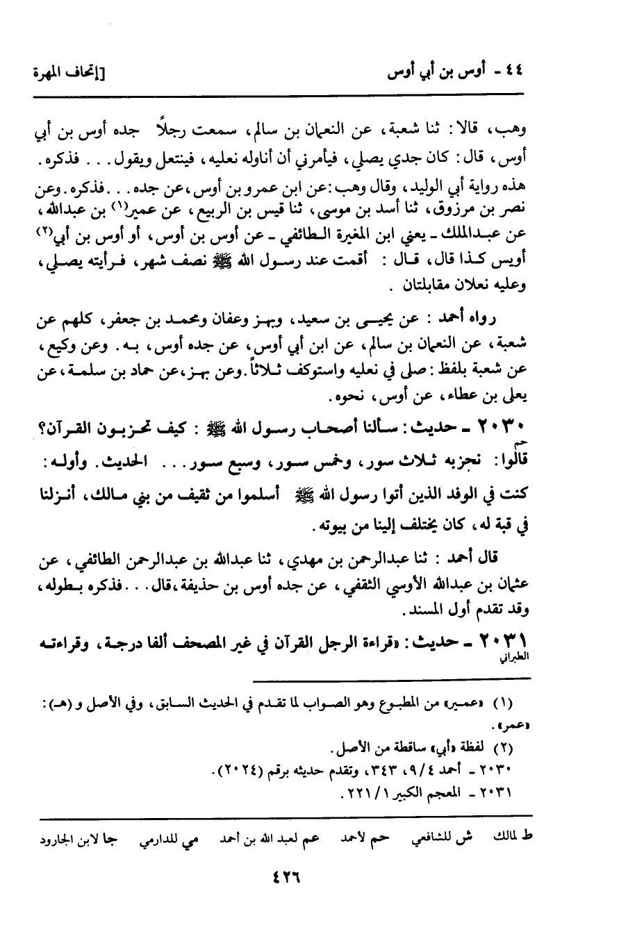 قَالَ أَحْمَدُ: ثنا عَبْدُ الرَّحْمَنِ بْنُ مَهْدِيٍّ، ثنا عَبْدُ اللَّهِ بْنُ عَبْدِ الرَّحْمَنِ الطَّائِفِيُّ، عَنْ عُثْمَانَ بْنِ عَبْدِ اللَّهِ الأَوْسِيِّ الثَّقَفِيِّ، عَنْ جَدِّهِ، أَوْسِ بْنِ حُذَيْفَةَ، قَالَ ... فَذَكَرَهُ بِطُولِهِ، وَقَدْ تَقَدَّمَ أَوَّلُ الْمُسْنَدِ.