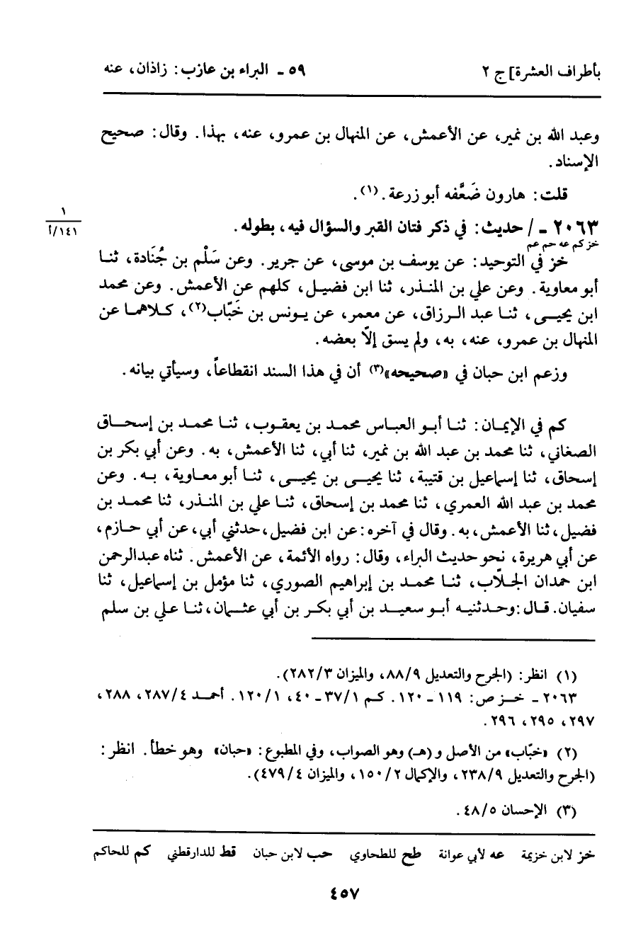 2063 - حَدِيثٌ (خز كم عه حم عم) : فِي ذِكْرِ فَتَّانِ الْقَبْرِ وَالسُّؤَالِ فِيهِ، بِطُولِهِ.