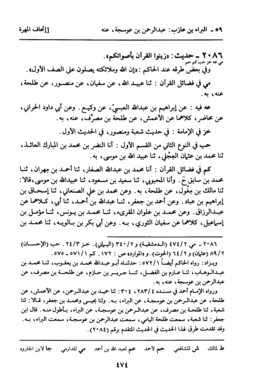 2086 - حَدِيثٌ (مي عه خز حب كم حم) : " زَيِّنُوا الْقُرْآنَ بِأَصْوَاتِكُمْ ".