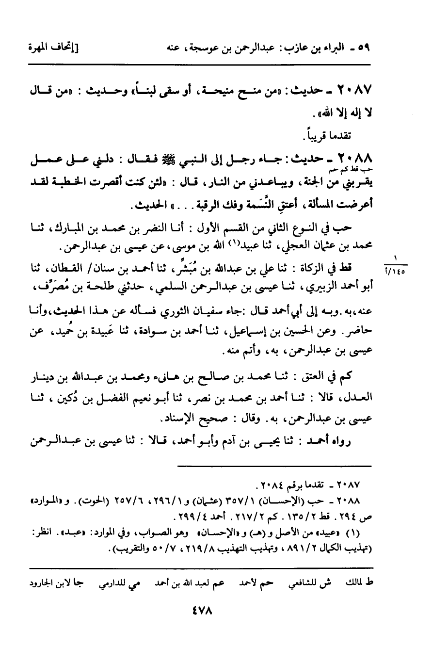2088 - حَدِيثٌ (حب قط كم حم) : جَاءَ رَجُلٌ إِلَى النَّبِيِّ، صلى الله عليه وسلم، فَقَالَ: دُلَّنِي عَلَى عَمَلٍ يُقَرِّبُنِي مِنَ الْجَنَّةِ، وَيُبَاعِدُنِي مِنَ النَّارِ، قَالَ: " لَئِنْ كُنْتَ أَقْصَرْتَ الْخُطْبَةَ لَقَدْ أَعْرَضْتَ الْمَسْأَلَةَ، أَعْتِقِ النَّسَمَةَ وَفُكَّ الرَّقَبَةَ ... " الْحَدِيثَ.