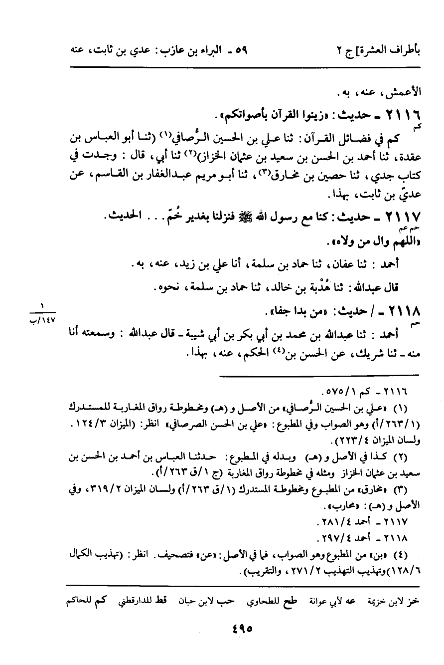 2117 - حَدِيثٌ (حم عم) : كُنَّا مَعَ رَسُولِ اللَّهِ، صلى الله عليه وسلم، فَنَزَلْنَا بِغَدِيرِ خُمٍّ ... الْحَدِيثَ.
