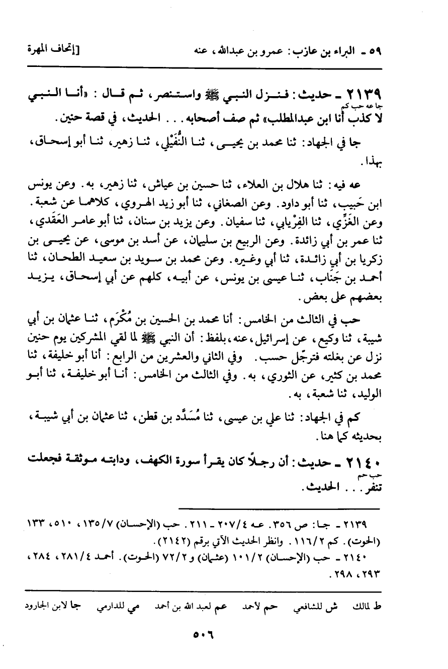 2139 - حَدِيثٌ (جا عه حب كم) : فَنَزَلَ النَّبِيُّ، صلى الله عليه وسلم، وَاسْتَنْصَرَ، ثُمَّ قَالَ: " أنا النَّبِيُّ لا كَذِبَ أنا ابْنُ عَبْدِ الْمُطَّلِبِ " ثُمَّ صَفَّ أَصْحَابَهُ ... الْحَدِيثَ، فِي قِصَّةِ حُنَيْنٍ.