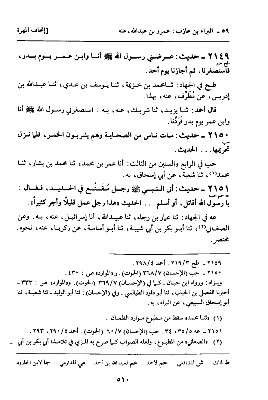 2149 - حَدِيثٌ (طح حم) : عَرَضَنِي رَسُولُ اللَّهِ، صلى الله عليه وسلم، أنا وَابْنُ عُمَرَ يَوْمَ بَدْرٍ، فَاسْتَصْغَرَنَا، ثُمَّ أَجَازَنَا يَوْمَ أُحُدٍ.