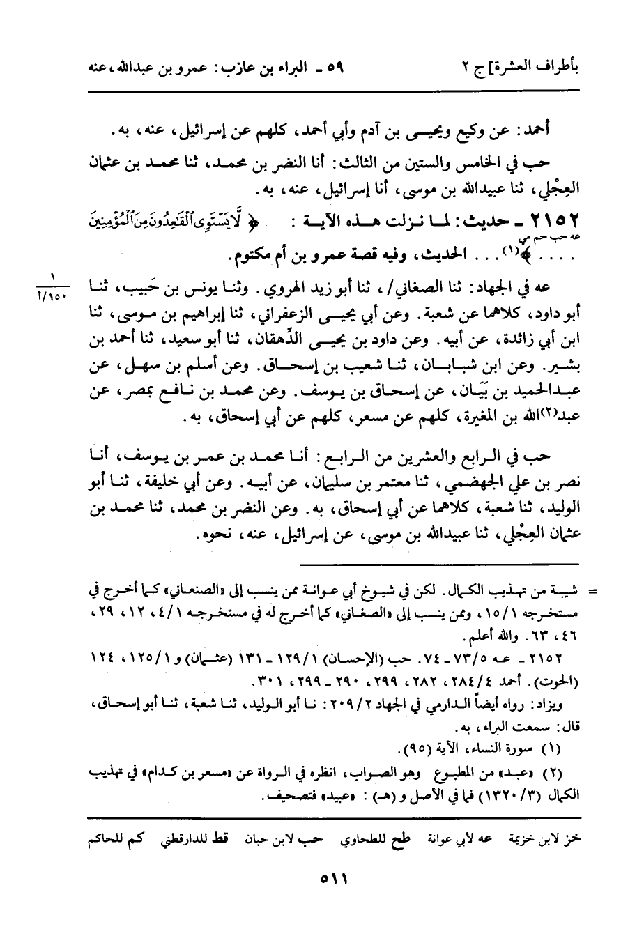 2152 - حَدِيثٌ (عه حب حم مي) : لَمَّا نَزَلَتْ هَذِهِ الآيَةُ: لا يَسْتَوِي الْقَاعِدُونَ مِنَ الْمُؤْمِنِينَ [سورة: النساء، آية 95] ... الْحَدِيثَ، وَفِيهِ قِصَّةُ عَمْرِو بْنِ أُمِّ مَكْتُومٍ.