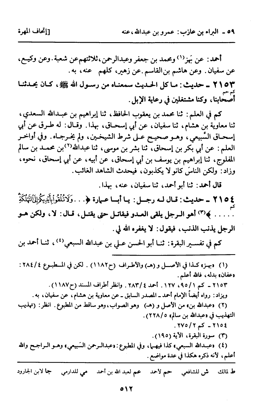 2153 - حَدِيثٌ (كم حم) : مَا كُلُّ الْحَدِيثِ سَمِعْنَاهُ مِنْ رَسُولِ اللَّهِ، صلى الله عليه وسلم، كَانَ يُحدثنا أَصْحَابُنَا، وَكُنَّا مُشْتَغِلِينَ فِي رِعَايَةِ الإِبِلِ.