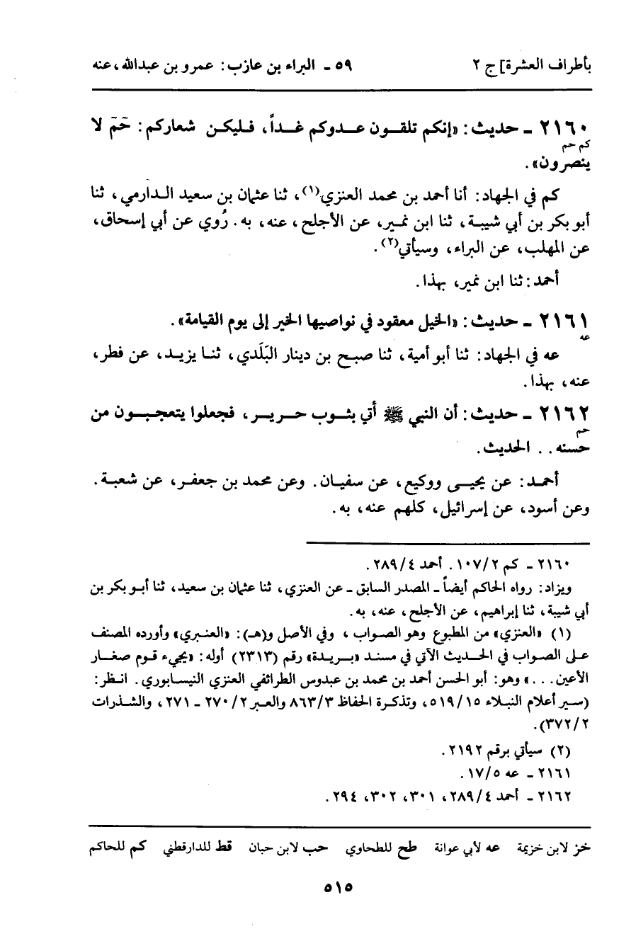 2161 - حَدِيثٌ (عه) : " الْخَيْلُ مَعْقُودٌ فِي نَوَاصِيهَا الْخَيْرُ إِلَى يَوْمِ الْقِيَامَةِ ".
