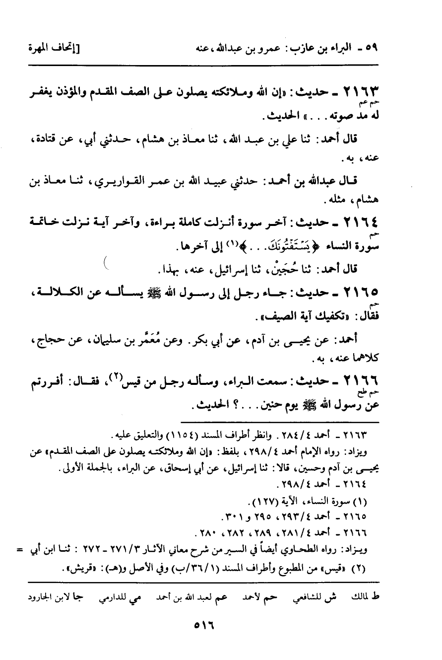 2166 - حَدِيثٌ (حم طح) : سَمِعْتُ الْبَرَاءَ، وَسَأَلَهُ رَجُلٌ مِنْ قَيْسٍ، فَقَالَ: أَفَرَرْتُمْ عَنْ رَسُولِ اللَّهِ، صلى الله عليه وسلم، يَوْمَ حُنَيْنٍ ... ؟ الْحَدِيثَ.