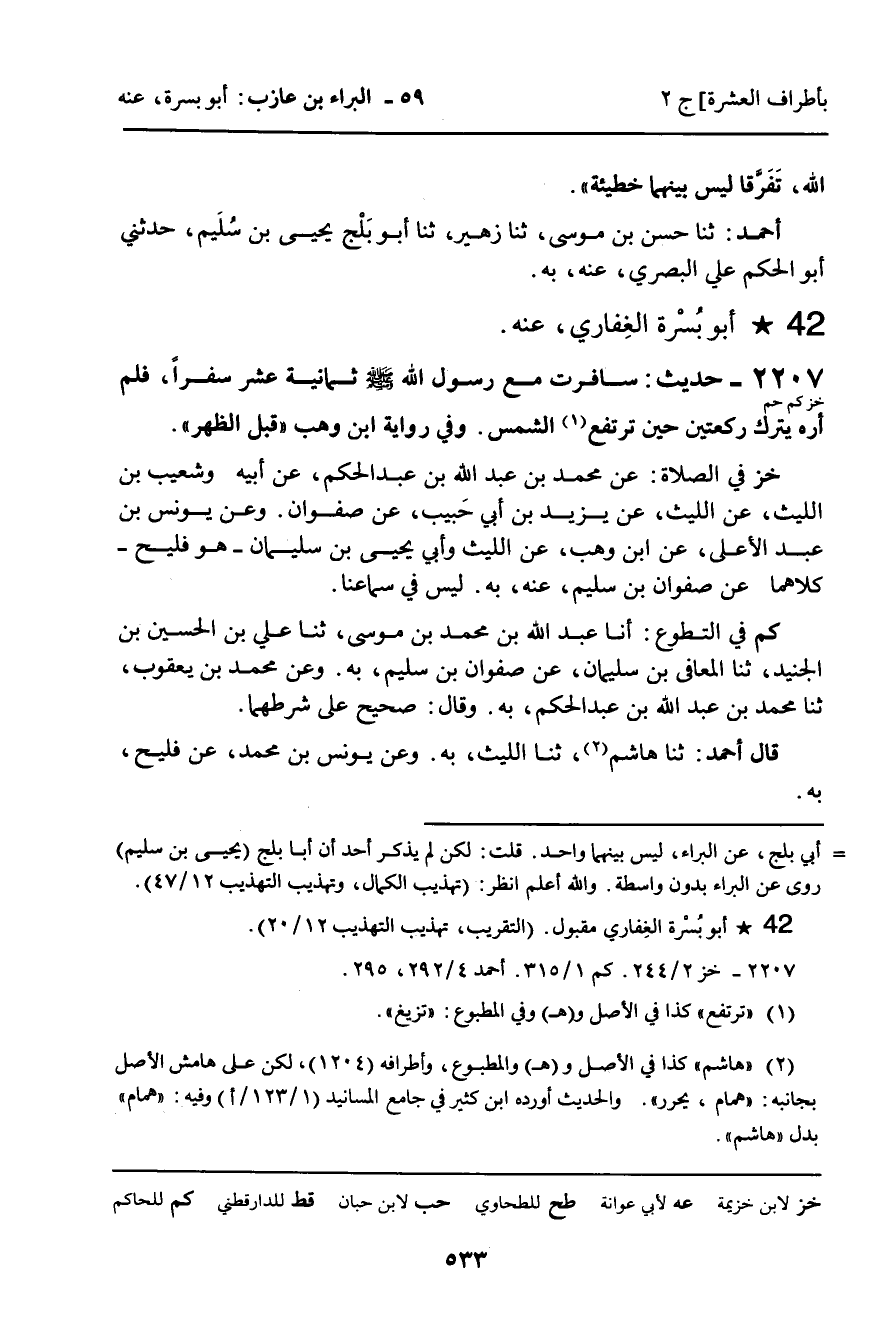 2207 - حَدِيثٌ (خز كم حم) : سَافَرْتُ مَعَ رَسُولِ اللَّهِ، صلى الله عليه وسلم، ثَمَانِيَةَ عَشَرَ سَفَرًا، فَلَمْ أَرَهُ يَتْرُكُ رَكْعَتَيْنِ حِينَ تَرْتَفِعُ الشَّمْسُ. وَفِي رِوَايَةِ ابْنِ وَهْبٍ: " قَبْلَ الظُّهْرِ ".