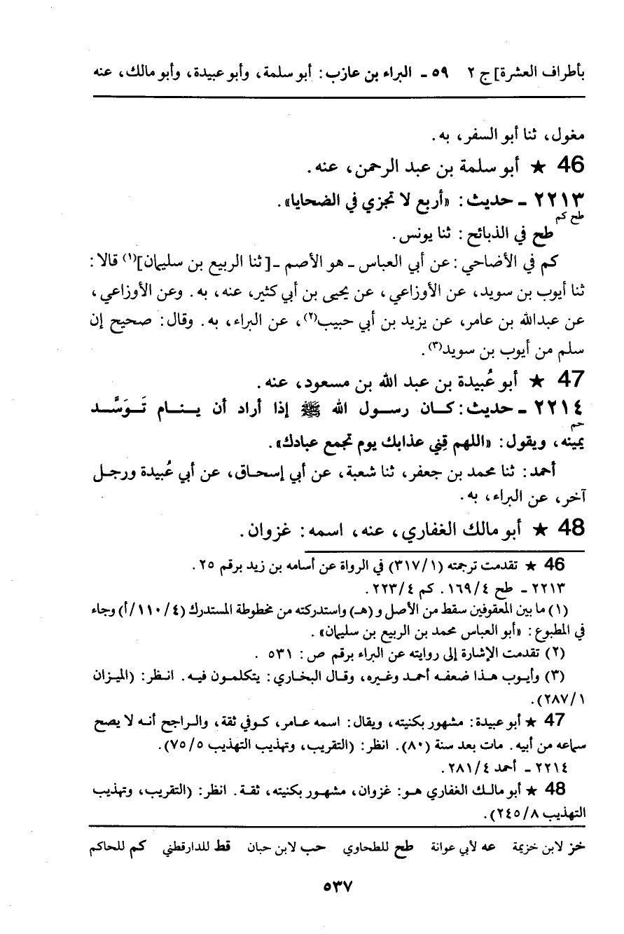 2213 - حَدِيثٌ (طح كم) : " أَرْبَعٌ لا تُجْزِي فِي الضَّحَايَا ".