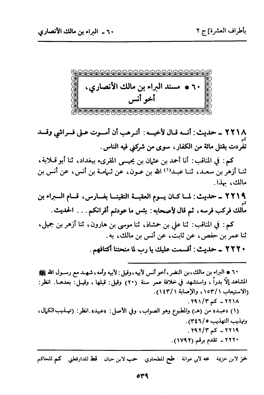 2219 - حَدِيثٌ (كم) : لَمَّا كَانَ يَوْمُ الْعَقَبَةِ الْتَقَيْنَا بِفَارِسَ، قَامَ الْبَرَاءُ بْنُ مَالِكٍ فَرَكِبَ فَرَسَهُ، ثُمَّ قَالَ لأَصْحَابِهِ: بِئْسَ مَا عَوَّدْتُمْ أَقْرَانَكُمُ ... الْحَدِيثَ.