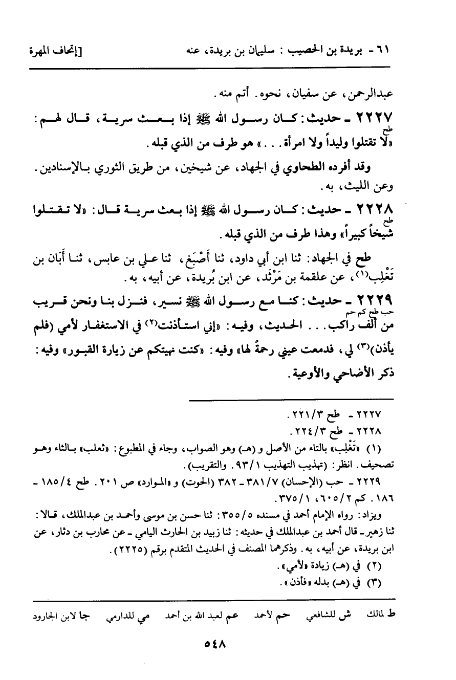 2227 - حَدِيثٌ (طح) : كَانَ رَسُولُ اللَّهِ، صلى الله عليه وسلم، إِذَا بَعَثَ سَرِيَّةً، قَالَ لَهُمْ: " لا تَقْتُلُوا وَلِيدًا وَلا امْرَأَةً ... " هُوَ طَرَفٌ مِنَ الَّذِي قَبْلَهُ.