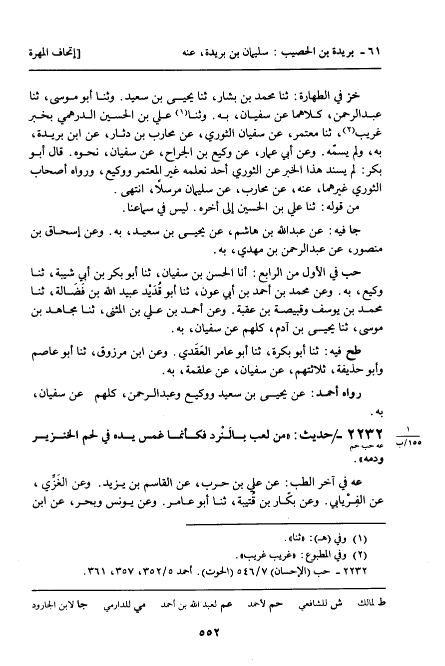 2232 - حَدِيثٌ (عه حب حم) : " مَنْ لَعِبَ بِالنَّرْدِ فَكَأَنَّمَا غَمَسَ يَدَهُ فِي لَحْمِ الْخِنْزِيرِ وَدَمِهِ ".