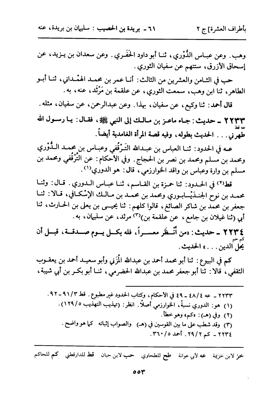2233 - حَدِيثٌ (عه قط) : جَاءَ مَاعِزُ بْنُ مَالِكٍ إِلَى النَّبِيِّ، صلى الله عليه وسلم، فَقَالَ: يَا رَسُولَ اللَّهِ، طَهِّرْنِي ... الْحَدِيثَ بِطُولِهِ، وَفِيهِ قِصَّةُ الْمَرْأَةِ الْغَامِدِيَّةِ أَيْضًا.