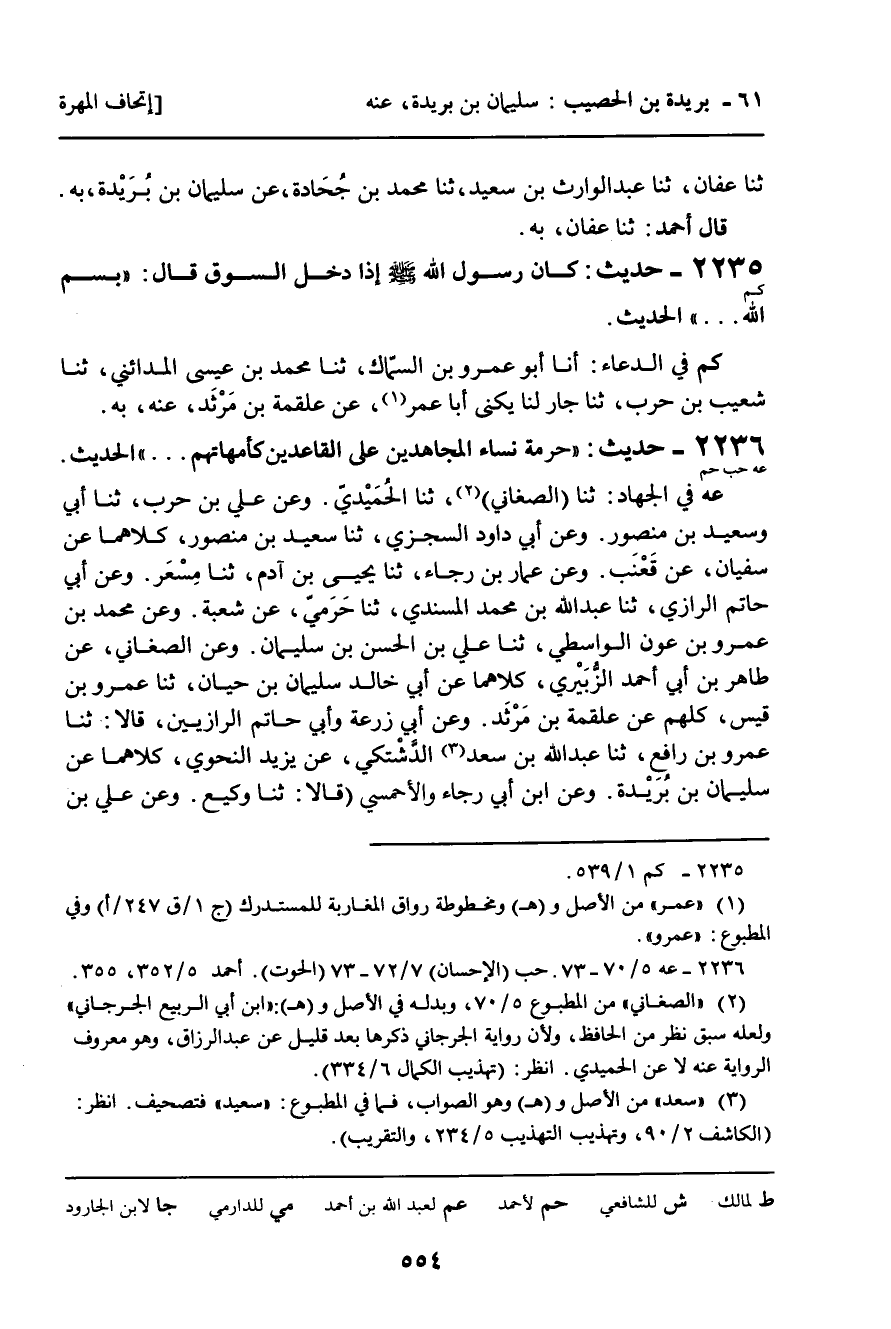عه فِي الْجِهَادِ: ثنا الصَّغَانِيُّ، ثنا الْحُمَيْدِيُّ، وَعَنْ عَلِيِّ بْنِ حَرْبٍ، ثنا أَبِي وَسَعِيدُ بْنُ مَنْصُورٍ. وَعَنْ أَبِي دَاوُدَ السِّجْزِيِّ، ثنا سَعِيدُ بْنُ مَنْصُورٍ، كِلاهُمَا عَنْ سُفْيَانَ، عَنْ قَعْنَبٍ. وَعَنْ عَمَّارِ بْنِ رَجَاءٍ، ثنا يَحْيَى بْنُ آدَمَ، ثنا مِسْعَرٌ. وَعَنْ أَبِي حَاتِمٍ الرَّازِيِّ، ثنا عَبْدُ اللَّهِ بْنُ مُحَمَّدٍ الْمُسْنَدِيُّ، ثنا حَرَمِيٌّ، عَنْ شُعْبَةَ. وَعَنْ مُحَمَّدِ بْنِ عَمْرِو بْنِ عَوْنٍ الْوَاسِطِيِّ، ثنا عَلِيُّ بْنُ الْحَسَنِ بْنِ سُلَيْمَانَ، وَعَنِ الصَّغَانِيِّ، عَنْ طَاهِرِ بْنِ أَبِي أَحْمَدَ الزُّبَيْرِيِّ، كِلاهُمَا عَنْ أَبِي خَالِدٍ سُلَيْمَانَ بْنِ حَيَّانَ، ثنا عَمْرُو بْنُ قَيْسٍ، كُلُّهُمْ عَنْ عَلْقَمَةَ بْنِ مَرْثَدٍ. وَعَنْ أَبِي زُرْعَةَ وَأَبِي حَاتِمٍ الرَّازِيَّيْنِ، قَالا: ثنا عَمْرُو بْنُ رَافِعٍ، ثنا عَبْدُ اللَّهِ بْنُ سَعْدٍ الدَّشْتَكِيُّ، عَنْ يَزِيدَ النَّحْوِيِّ، كِلاهُمَا عَنْ سُلَيْمَانَ بْنِ بُرَيْدَةَ. وَعَنِ ابْنِ أَبِي رَجَاءٍ وَالأَحْمَسِيِّ قَالا: ثنا وَكِيعٌ. وَعَنْ عَلِيِّ بْنِ