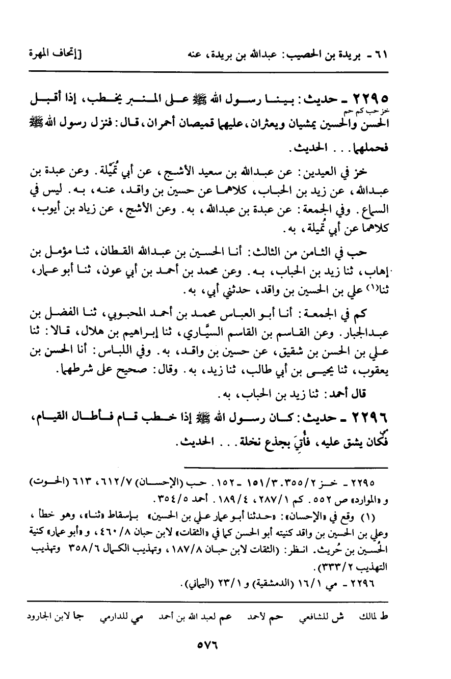 2295 - حَدِيثٌ (خز حب كم حم) : بَيْنَا رَسُولُ اللَّهِ، صلى الله عليه وسلم، عَلَى الْمِنْبَرِ يَخْطُبُ، إِذْ أَقْبَلَ الْحَسَنُ وَالْحُسَيْنُ يَمْشِيَانِ وَيَعْثُرَانِ، عَلَيْهِمَا قَمِيصَانِ أَحْمَرَانِ، قَالَ: فَنَزَلَ رَسُولُ اللَّهِ، صلى الله عليه وسلم، فَحَمَلَهُمَا ... الْحَدِيثَ.