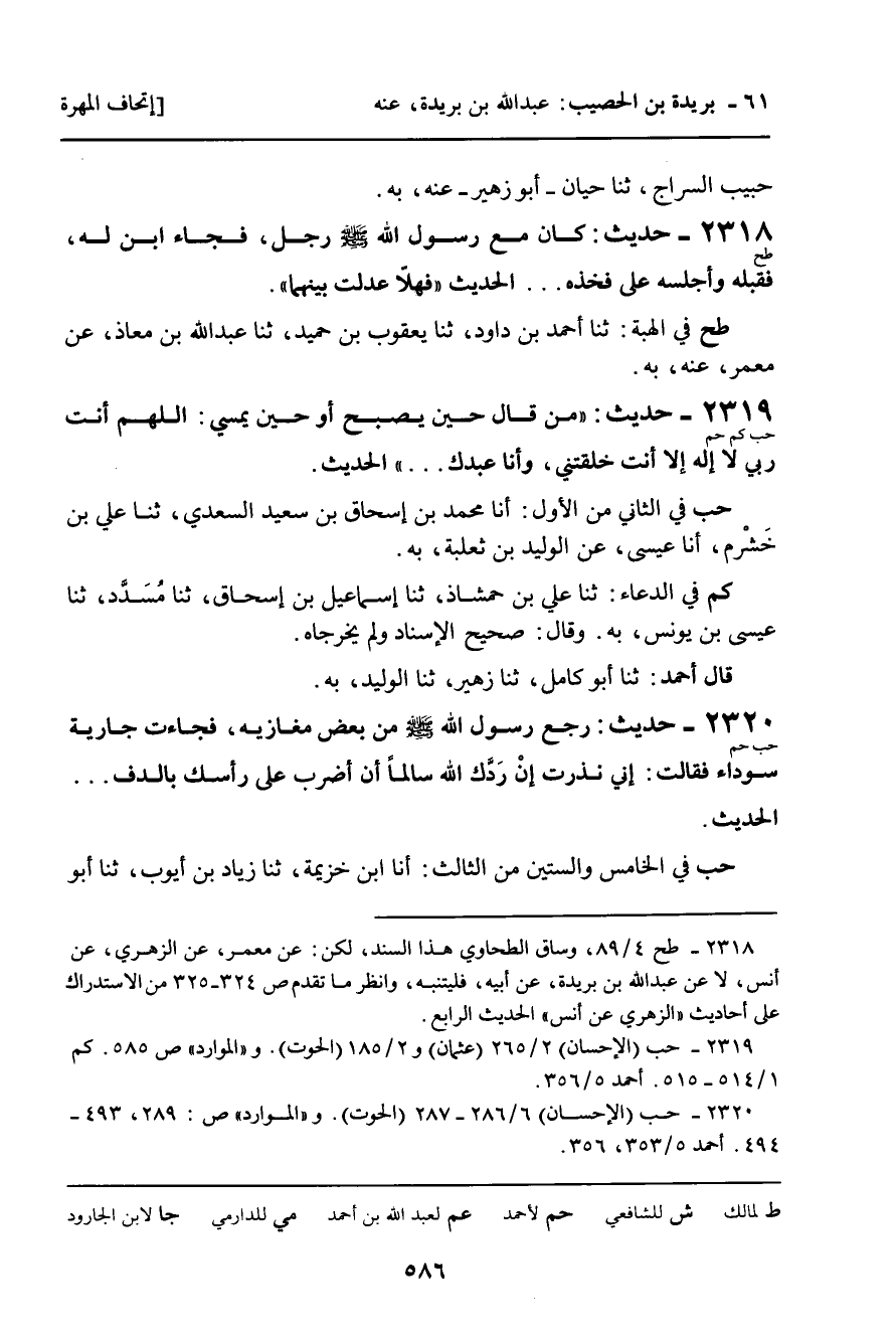 2320 - حَدِيثٌ (حب حم) : رَجَعَ رَسُولُ اللَّهِ، صلى الله عليه وسلم، مِنْ بَعْضِ مَغَازِيهِ، فَجَاءَتْ جَارِيَةٌ سَوْدَاءُ , فَقَالَتْ: إِنِّي نَذَرْتُ إِنْ رَدَّكَ اللَّهُ سَالِمًا أَنْ أَضْرِبَ عَلَى رَأْسِكَ بِالدُّفِّ ... الْحَدِيثَ.