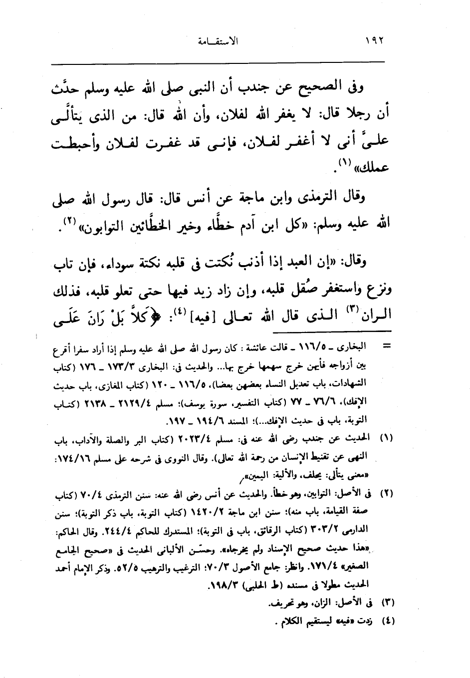 وَقَالَ ان العَبْد اذا اذنب نكتت فِي قلبه نكته سَوْدَاء فَإِن تَابَ وَنزع واستغفر صقل قلبه وان زَاد فِيهَا حَتَّى تعلو قلبه فَذَلِك الران الَّذِي قَالَ الله تَعَالَى فِيهِ كلا بل ران على