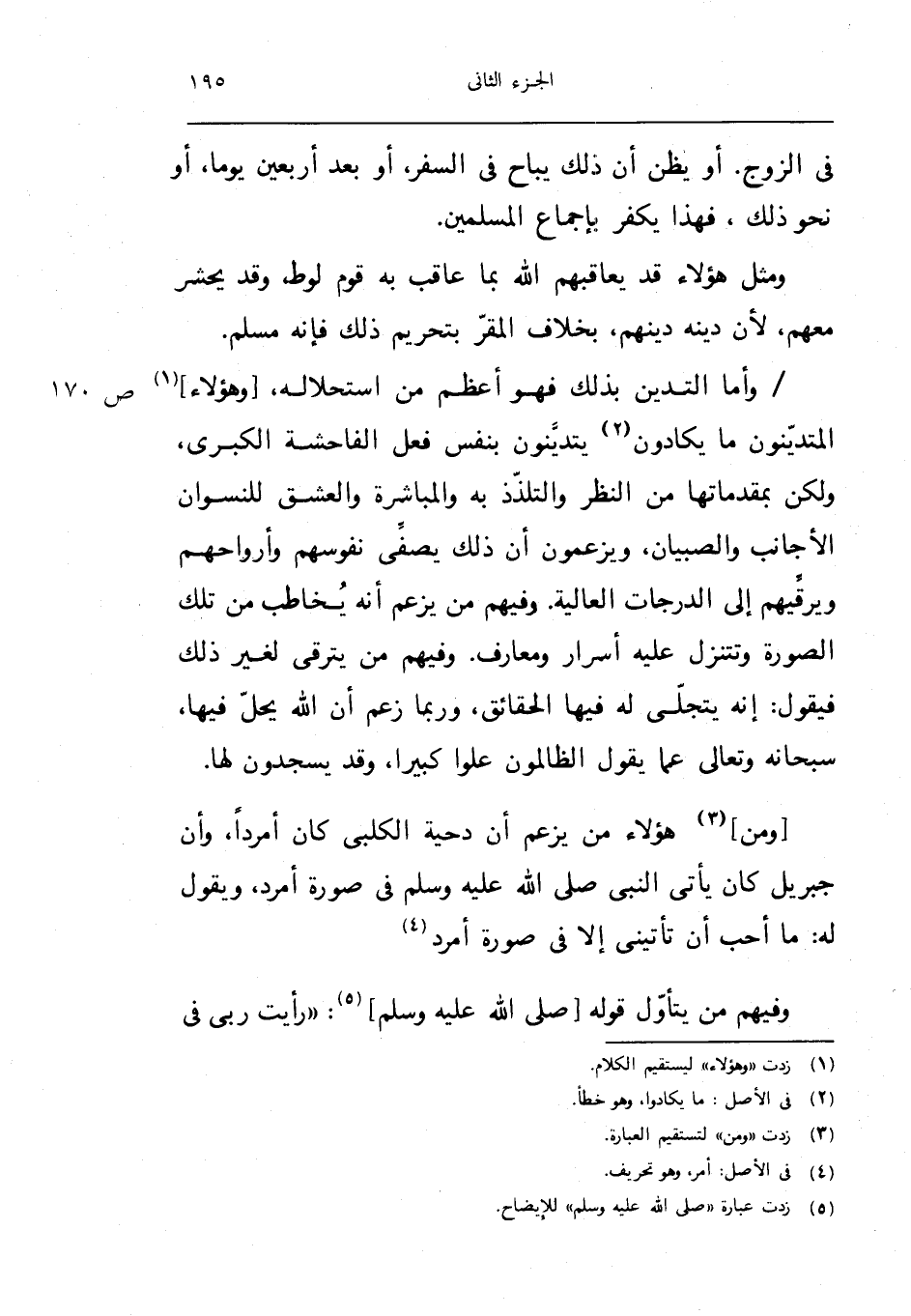 واما التدين بذلك فَهُوَ اعظم من استحلاله وَهَؤُلَاء المتدينون مَا يكادون يتدينون بِنَفس فعل الْفَاحِشَة الْكُبْرَى وَلَكِن بمقدماتها من النّظر والتلذذ بِهِ والمباشرة والعشق للنسوان الاجانب وَالصبيان ويزعمون ان ذَلِك يصفي نُفُوسهم وارواحهم ويرقيهم الى الدَّرَجَات الْعَالِيَة وَفِيهِمْ من يزْعم انه يُخَاطب من تِلْكَ الصُّورَة وتتنزل عَلَيْهِ اسرار ومعارف وَفِيهِمْ من يترقى لغير ذَلِك فَيَقُول انه يتجلى لَهُ فِيهَا الْحَقَائِق وَرُبمَا زعم ان الله يحل فِيهَا سُبْحَانَهُ وَتَعَالَى عَمَّا يَقُول الظَّالِمُونَ علوا كَبِيرا وَقد يَسْجُدُونَ لَهَا