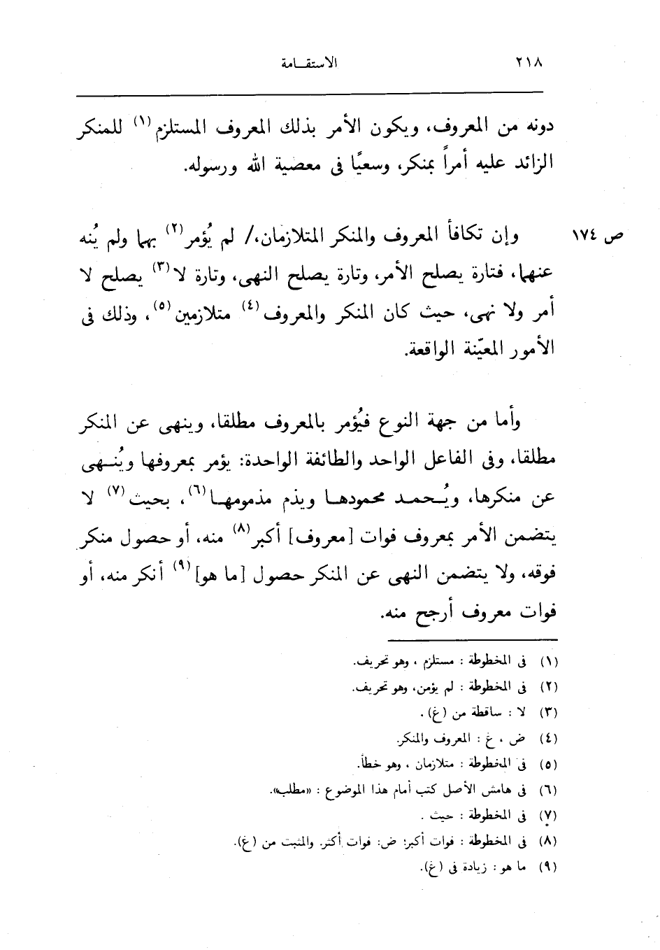 وان تكافأ الْمَعْرُوف وَالْمُنكر المتلازمان لم يُؤمر بهما وَلم ينْه عَنْهُمَا فَتَارَة يصلح الامر وَتارَة يصلح النَّهْي وَتارَة لَا يصلح لَا امْر وَلَا نهي حَيْثُ كَانَ الْمُنكر وَالْمَعْرُوف متلازمين وَذَلِكَ فِي الامور الْمعينَة الْوَاقِعَة