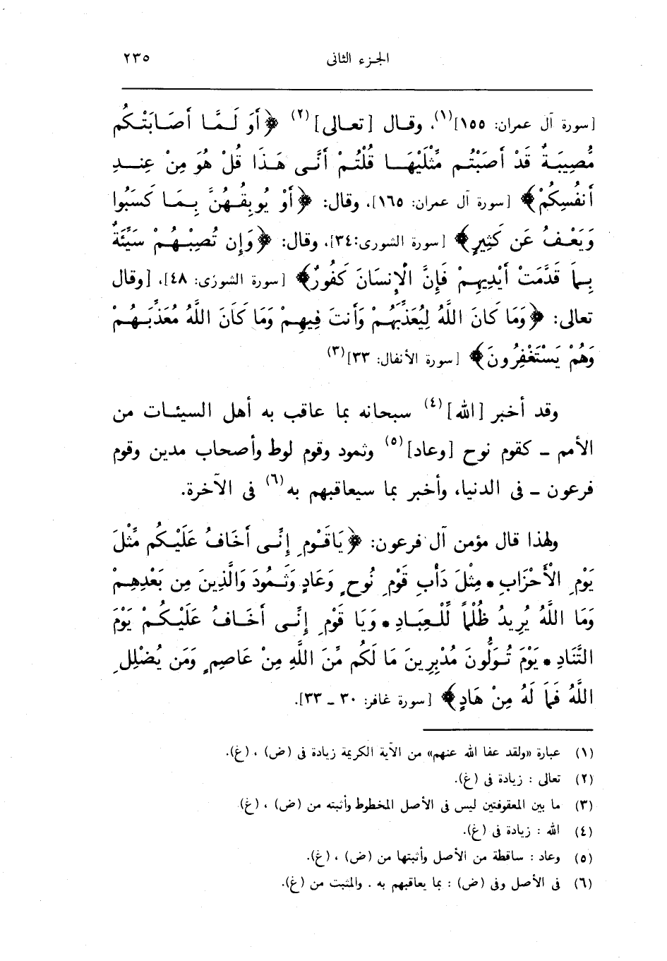 وَلِهَذَا قَالَ مُؤمن آل فِرْعَوْن يَا قوم اني اخاف عَلَيْكُم مثل يَوْم الاحزاب مثل دأب قوم نوح وَعَاد وَثَمُود وَالَّذين من بعدهمْ وَمَا الله يُرِيد ظلما للعباد وَيَا قوم اني اخاف عَلَيْكُم يَوْم التناد يَوْم تولون مُدبرين مَا لكم من الله من عَاصِم وَمن يضلل الله فَمَا لَهُ من هاد سُورَة غَافِر 30 33