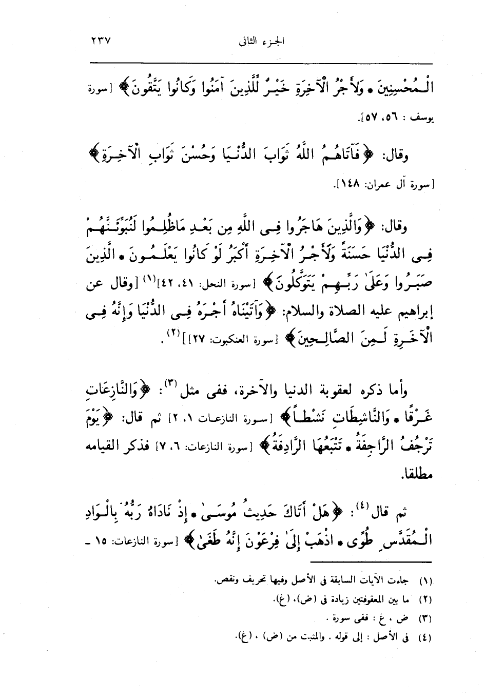 واما ذكره لعقوبة الدُّنْيَا والاخرة فَفِي مثل والنازعات غرقا والناشطات نشطا سُورَة النازعات 201 ثمَّ قَالَ يَوْم ترجف الراجفة تتبعها الرادفة سُورَة النازعات فَذكر القيامه مُطلقًا