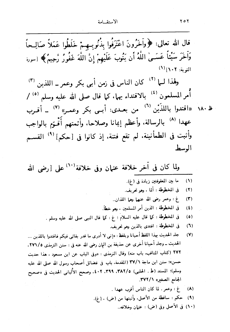 وَلِهَذَا لما كَانَ النَّاس فِي زمن ابي بكر وَعمر اللَّذين امْر الْمُسلمُونَ بالاقتداء بهما كَمَا قَالَ صلى الله عَلَيْهِ وَسلم اقتدوا باللذين من بعدِي ابي بكر وَعمر اقْربْ عهدا بالرسالة وَأعظم ايمانا وصلاحا وأئمتهم اقوم بِالْوَاجِبِ واثبت فِي الطُّمَأْنِينَة لم تقع فتْنَة اذ كَانُوا فِي حكم الْقسم الْوسط