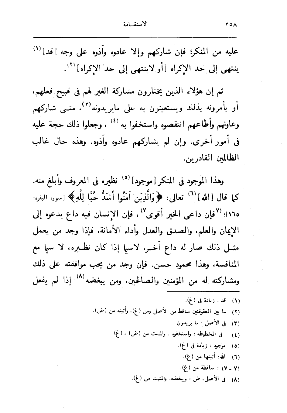 وَهَذَا الْمَوْجُود فِي الْمُنكر مَوْجُود نَظِيره فِي الْمَعْرُوف وابلغ مِنْهُ كَمَا قَالَ الله تَعَالَى {وَالَّذين آمنُوا أَشد حبا لله} سُورَة الْبَقَرَة 165 فَإِن دَاعِي الْخَيْر اقوى فَإِن الانسان فِيهِ دَاع يَدعُوهُ الى الايمان وَالْعلم الصدْق وَالْعدْل واداء الامانة فاذا وجد من يعْمل مثل ذَلِك صَار لَهُ دَاع اخر لَا سِيمَا اذا كَانَ نَظِيره لَا سِيمَا مَعَ المنافسة وَهَذَا مَحْمُود حسن فَإِن وجد من يحب مُوَافَقَته على ذَلِك ومشاركته لَهُ من الْمُؤمنِينَ وَالصَّالِحِينَ وَمن يبغضه اذا لم يفعل