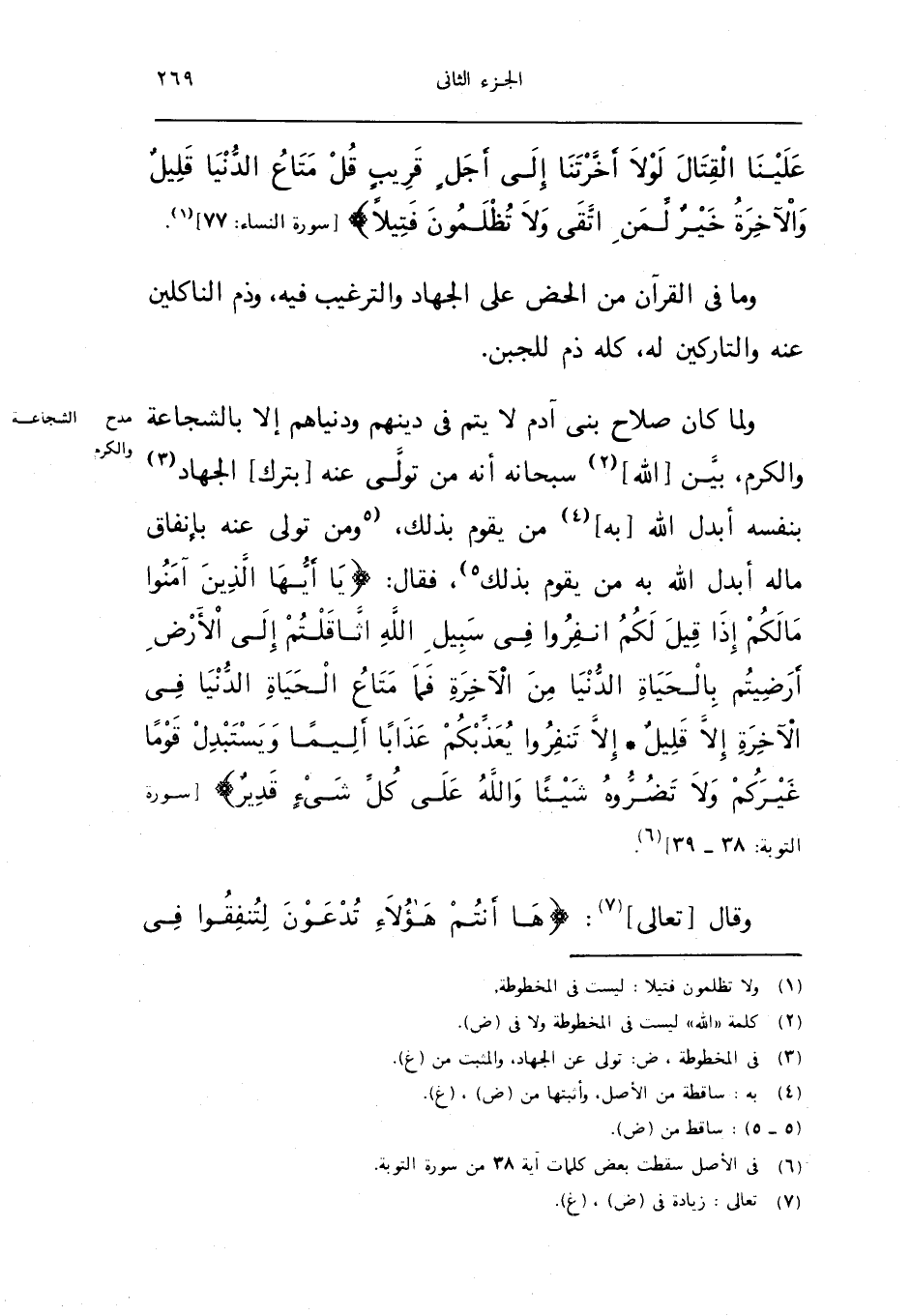 وَلما كَانَ صَلَاح بني آدم لَا يتم فِي دينهم ودنياهم الا بالشجاعة وَالْكَرم بَين الله سُبْحَانَهُ انه من تولى عَنهُ بترك الْجِهَاد بِنَفسِهِ ابدل الله بِهِ من يقوم بذلك وَمن تولى عَنهُ بإنفاق مَاله ابدل الله بِهِ من يقوم بذلك فَقَالَ يَا ايها الَّذين امنوا مالكم اذا قيل لكم انفروا فِي سَبِيل الله اثاقلتم الى الارض ارضيتم بِالْحَيَاةِ الدُّنْيَا من الاخرة فَمَا مَتَاع الْحَيَاة الدُّنْيَا فِي الاخرة الا قَلِيل الا تنفرُوا يعذبكم عذَابا اليما ويستبدل قوما غَيْركُمْ وَلَا تضروه شَيْئا وَالله على كل شَيْء قدير سُورَة التَّوْبَة 38 39