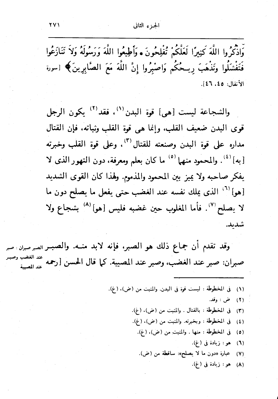 والشجاعة لَيست هِيَ قُوَّة الْبدن فقد يكون الرجل قوي الْبدن ضَعِيف الْقلب وانما هِيَ قُوَّة الْقلب وثباته فَأن الْقِتَال مَدَاره على قُوَّة الْبدن وصنعته لِلْقِتَالِ وعَلى قُوَّة الْقلب وخبرته بِهِ والمحمود مِنْهُمَا مَا كَانَ بِعلم وَمَعْرِفَة دون التهور الَّذِي لَا يفكر صَاحبه وَلَا يُمَيّز بَين الْمَحْمُود والمذموم وَلِهَذَا كَانَ الْقوي الشَّديد هُوَ الَّذِي يملك نَفسه عِنْد الْغَضَب حَتَّى يفعل مَا يصلح دون مَا لَا يصلح فَأَما المغلوب حِين غَضَبه فَلَيْسَ هُوَ بِشُجَاعٍ وَلَا شَدِيد
