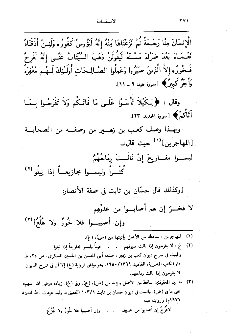 وَبِهَذَا وصف كَعْب بن زُهَيْر من وَصفه من الصَّحَابَة الْمُهَاجِرين حَيْثُ قَالَ ... لَيْسُوا مفاريح ان نَالَتْ رماحهم ... كثرا وَلَيْسوا مجازيعا اذا نيلوا ... وَكَذَلِكَ قَالَ حسان بن ثَابت فِي صفة الانصار ... لَا فَخر ان هم اصابوا من عدوهم ... وان اصيبوا فَلَا خور وَلَا هلع ...