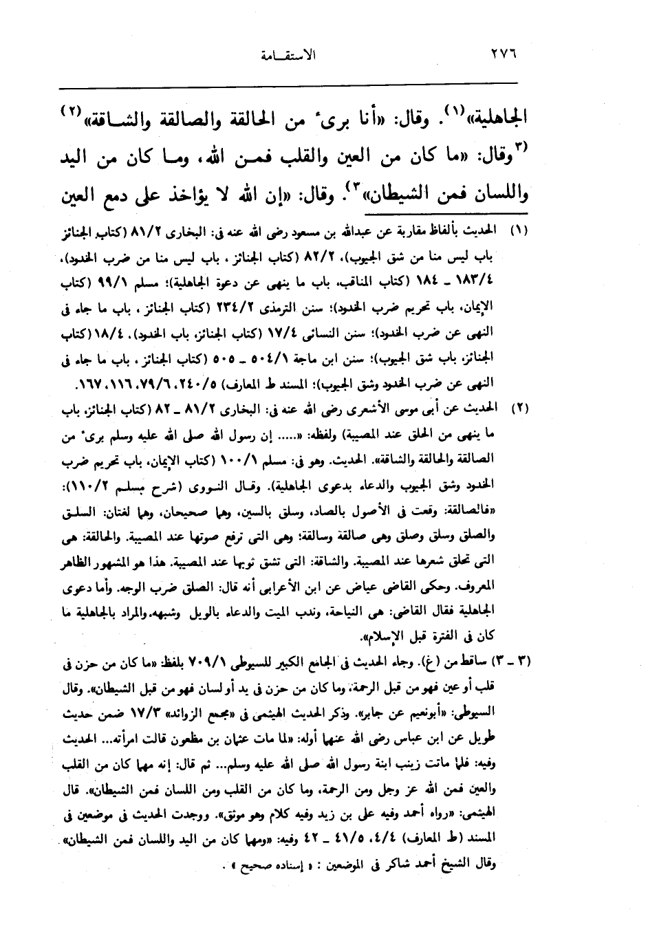 الْجَاهِلِيَّة وَقَالَ انا برِئ من الحالقة والصالقة والشاقة وَقَالَ مَا كَانَ من الْعين وَالْقلب فَمن الله وَمَا كَانَ من الْيَد وَاللِّسَان فَمن الشَّيْطَان وَقَالَ ان الله لَا يُؤَاخذ على دمع الْعين