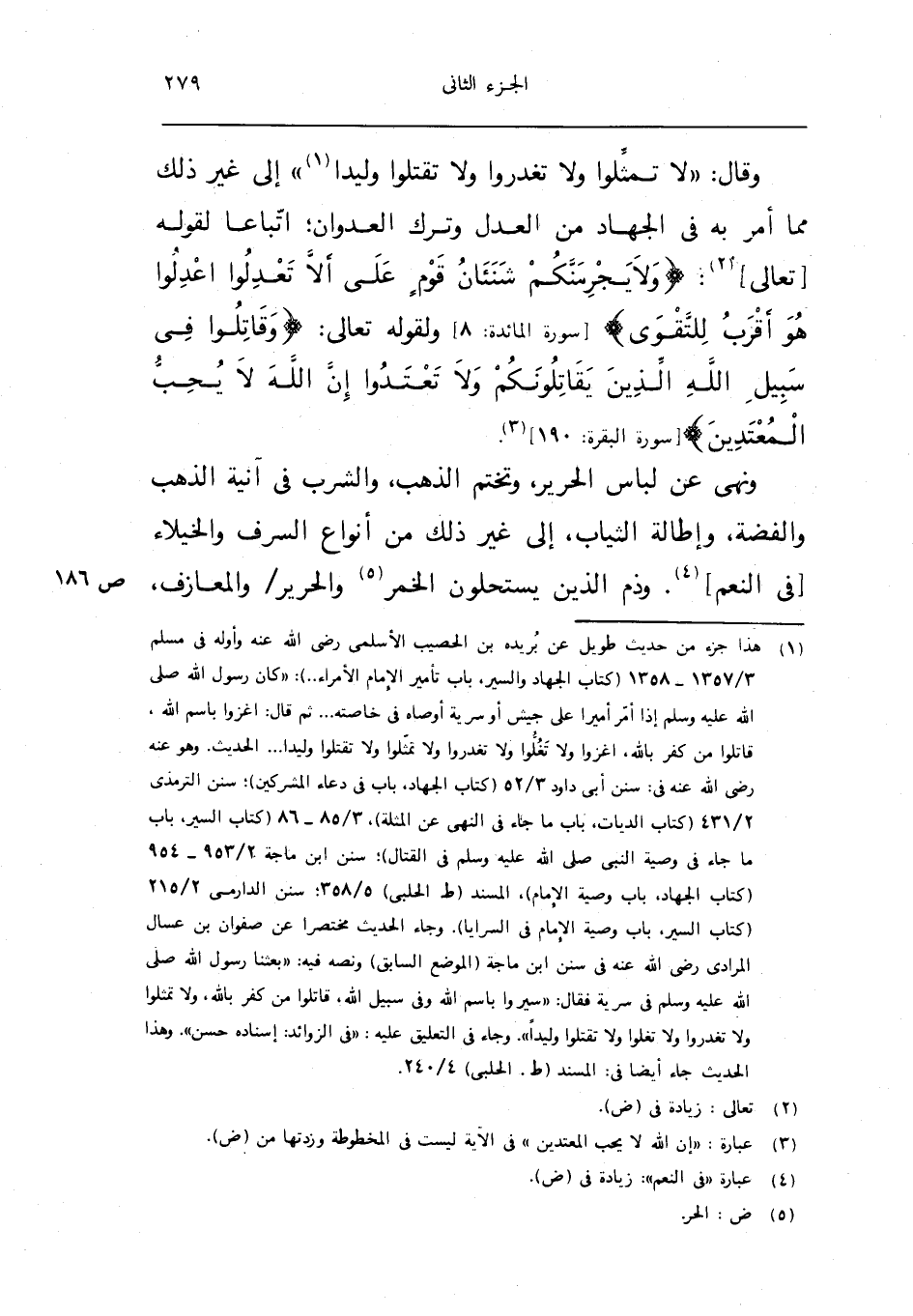 وَقَالَ لَا تمثلوا وَلَا تغدروا وَلَا تقتلُوا وليدا الى غير ذَلِك مِمَّا امْر بِهِ فِي الْجِهَاد من الْعدْل وَترك الْعدوان اتبَاعا لقَوْله تَعَالَى {وَلَا يجرمنكم شنآن قوم على أَلا تعدلوا اعدلوا هُوَ أقرب للتقوى} سُورَة الْمَائِدَة 8 وَلقَوْله تَعَالَى {وقاتلوا فِي سَبِيل الله الَّذين يقاتلونكم وَلَا تَعْتَدوا إِن الله لَا يحب الْمُعْتَدِينَ} سُورَة الْبَقَرَة 190