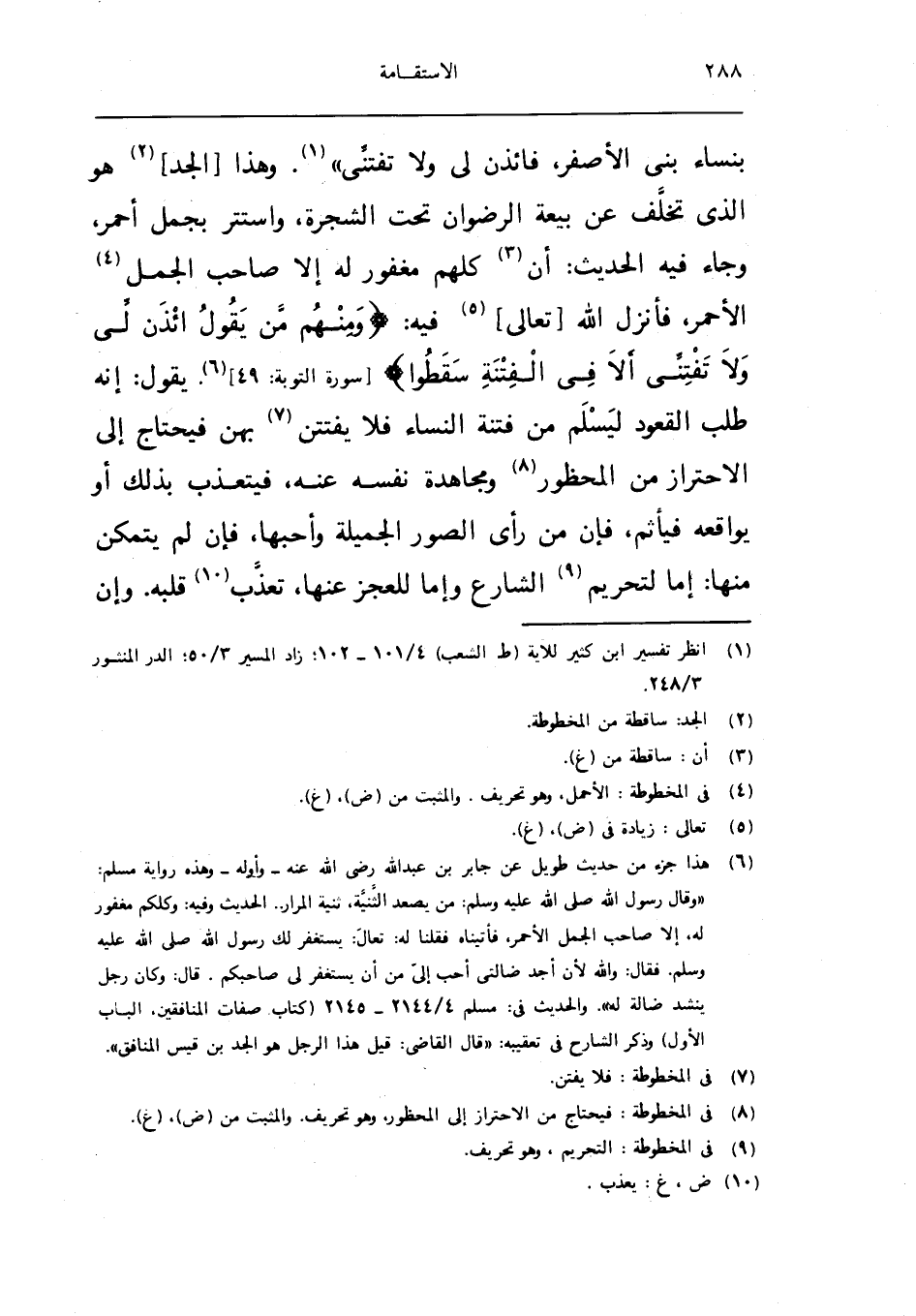 بنساء بني الاصفر فائذن لي وَلَا تفتني وَهَذَا الْجد هُوَ الَّذِي تخلف عَن بيعَة الرضْوَان تَحت الشَّجَرَة واستتر بجمل احمر وَجَاء فِيهِ الحَدِيث ان كلهم مغْفُور لَهُ الا صَاحب الْجمل الاحمر فَأنْزل الله تَعَالَى فِيهِ {وَمِنْهُم من يَقُول ائْذَنْ لي وَلَا تفتني أَلا فِي الْفِتْنَة سقطوا} سُورَة التَّوْبَة 49 يَقُول انه طلب الْقعُود ليسلم من فتْنَة النِّسَاء فَلَا يفتتن بِهن فَيحْتَاج الى الِاحْتِرَاز من الْمَحْظُور ومجاهدة نَفسه عَنهُ فيتعذب بذلك اَوْ يواقعه فيأثم فَإِن من رأى الصُّور الجميلة وأحبها فَإِن لم يتَمَكَّن مِنْهَا اما لتَحْرِيم الشَّارِع وَأما للعجز عَنْهَا تعذب قلبه وان