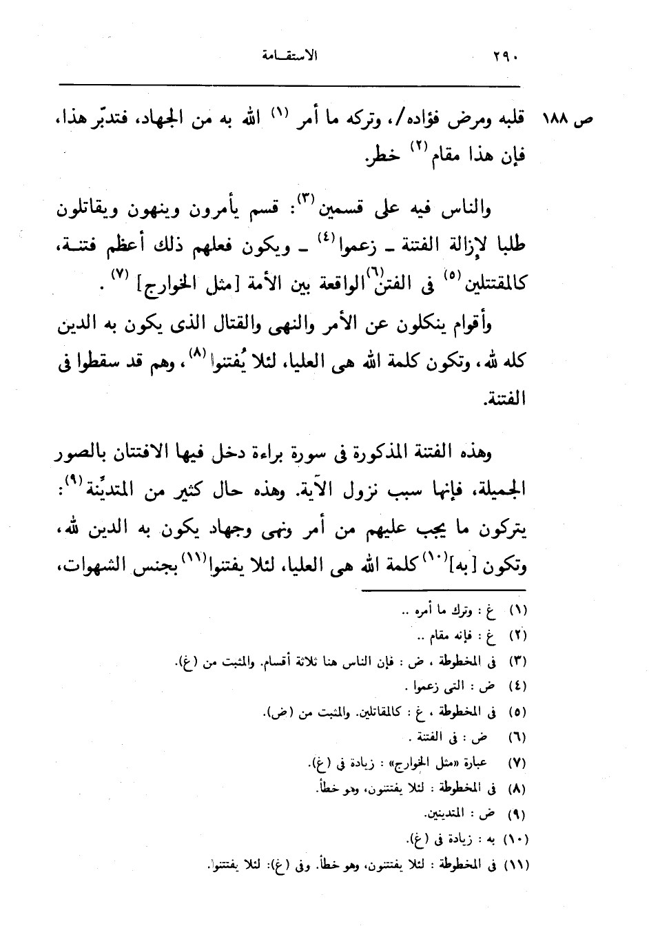 وَالنَّاس فِيهِ على قسمَيْنِ قسم يأمرون وَينْهَوْنَ ويقاتلون طلبا لإِزَالَة الْفِتْنَة زَعَمُوا وَيكون فعلهم ذَلِك اعظم فتْنَة كالمقتتلين فِي الْفِتَن الْوَاقِعَة بَين الامة مثل الْخَوَارِج