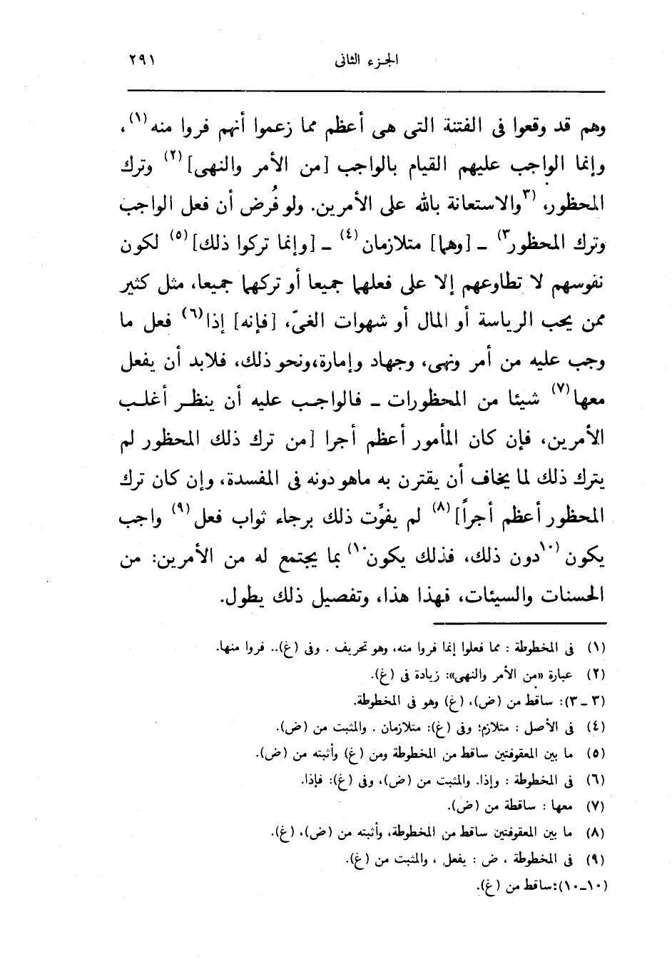 وهم قد وَقَعُوا فِي الْفِتْنَة الَّتِي هِيَ اعظم مِمَّا زَعَمُوا انهم فروا مِنْهُ وانما الْوَاجِبَة عَلَيْهِم الْقيام بِالْوَاجِبِ من الامر وَالنَّهْي وَترك الْمَحْظُور والاستعانة بِاللَّه على الامرين وَلَو فرض ان فعل الْوَاجِب وَترك الْمَحْظُور وهما متلازمان وانما تركُوا ذَلِك لكَون نُفُوسهم لَا تطاوعهم الا على فعلهمَا جَمِيعًا اَوْ تكرهما جَمِيعًا مثل كثير مِمَّن يجب الرياسة اَوْ المَال اَوْ شهوات الغي فانه اذا فعل مَا وَجب عَلَيْهِ من امْر وَنهي وَجِهَاد وامارة وَنَحْو ذَلِك فَلَا بُد ان يفعل مَعهَا شَيْئا من الْمَحْظُورَات فَالْوَاجِب عَلَيْهِ ان ينظر أغلب الامرين فَإِن كَانَ الْمَأْمُور اعظم اجرا من ترك ذَلِك الْمَحْظُور لم يتْرك ذَلِك لما يخَاف ان يقْتَرن بِهِ مَا هُوَ دونه فِي الْمفْسدَة وان كَانَ ترك الْمَحْظُور اعظم اجرا لم يفوت ذَلِك برجاء ثَوَاب فعل وَاجِب يكون دون ذَلِك فَذَلِك يكون بِمَا يجْتَمع لَهُ من الامرين من الْحَسَنَات والسيئات فَهَذَا هَذَا وتفصيل ذَلِك يطول